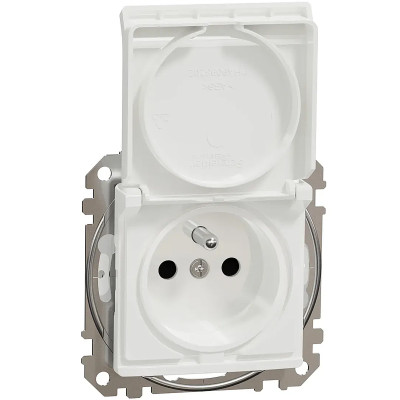 Biela IP44 zásuvka Sedna 2P+PE s viečkom, clonkami a bezskrutkovými svorkami, zo série Sedna...