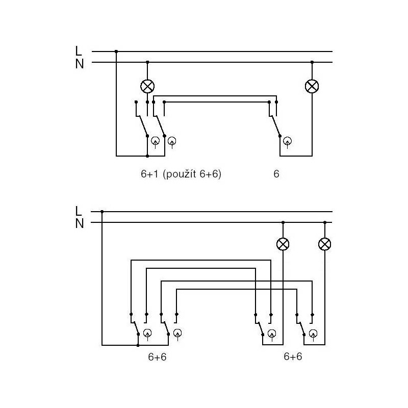 - Radenie: vypínač č.5B, 6+6 (ovláda 2 svietidlá z dvoch miest) dvojitý prepínač