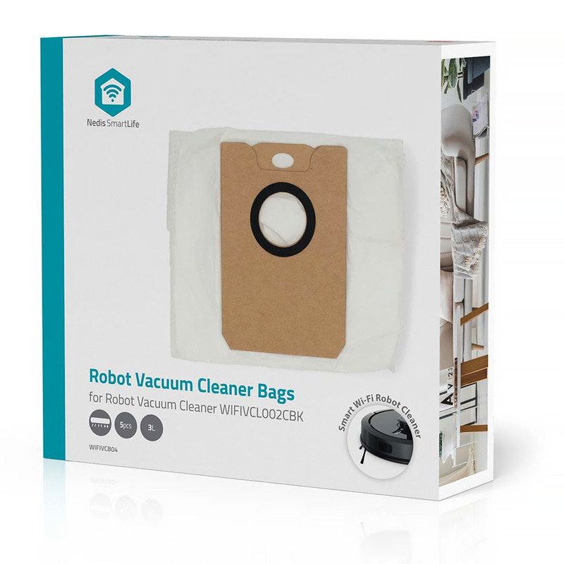 Základňa WIFIVCL002CBK automaticky vyprázdni nádobu na prach chytrého robotického vysávača Nedis pri nabíjaní. Má skladovaciu kapacitu až tri litre. Po ± 25 vyprázdňovacích cykloch je vrecko plné, ktoré jednoducho vyhodíte do odpadkového koša. S týmito náhradnými vreckami okamžite získate zásobu na nadchádzajúce mesiace.