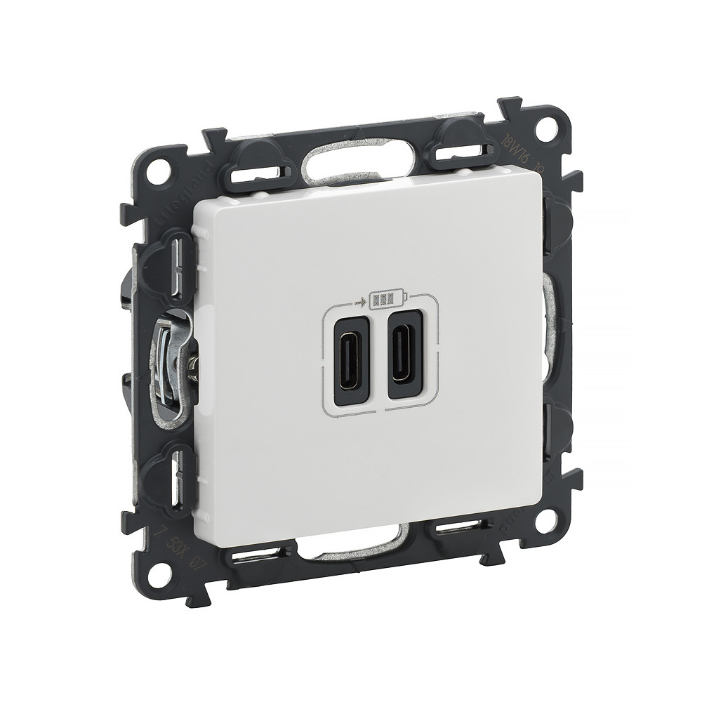 VALENA LIFE USB nabíjačka C+C 3A 15W biela - 753107 od značky Legrand je moderná nabíjacia zásuvka určená na priame nabíjanie mobilných zariadení bez potreby napájacieho adaptéra. Je ideálna pre smartfóny, tablety, bezdrôtové slúchadlá alebo ďalšie zariadenia s USB-C konektorom.