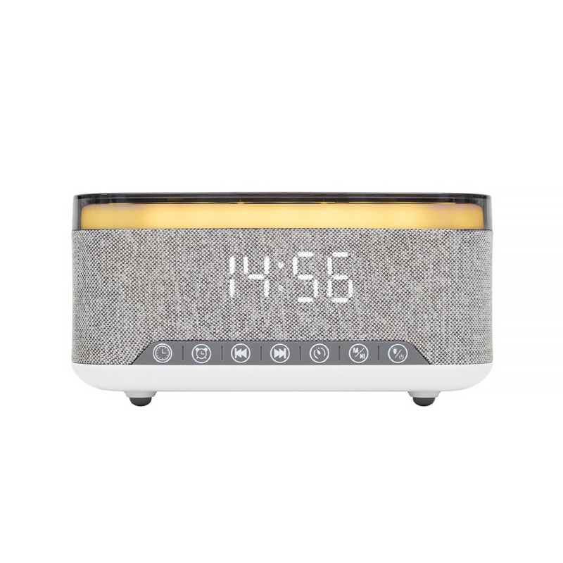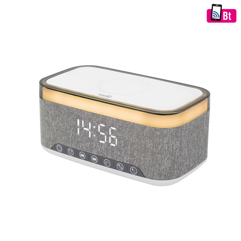 Multimediálny prehrávač s budíkom, bezdrôtovou Qi nabíjačkou • 2x 5W stereo +basrepro • budík s voliteľným zvuk.efektom • časovač vypnutia • bezdrôtové stereo BT • hovory bez dotyku pomocou zabudovaného mikrofónu • prehrávanie z USB/microSD • FM rádio s auto-ladením • vstup AUX, 3.5 mm • nočné svetlo s bielym alebo farebným osvetlením • svetelná hudba • exkluzívny textilný dizajn, biely LED displej • vstavaný akumulátor • čas prevádzky:~7h