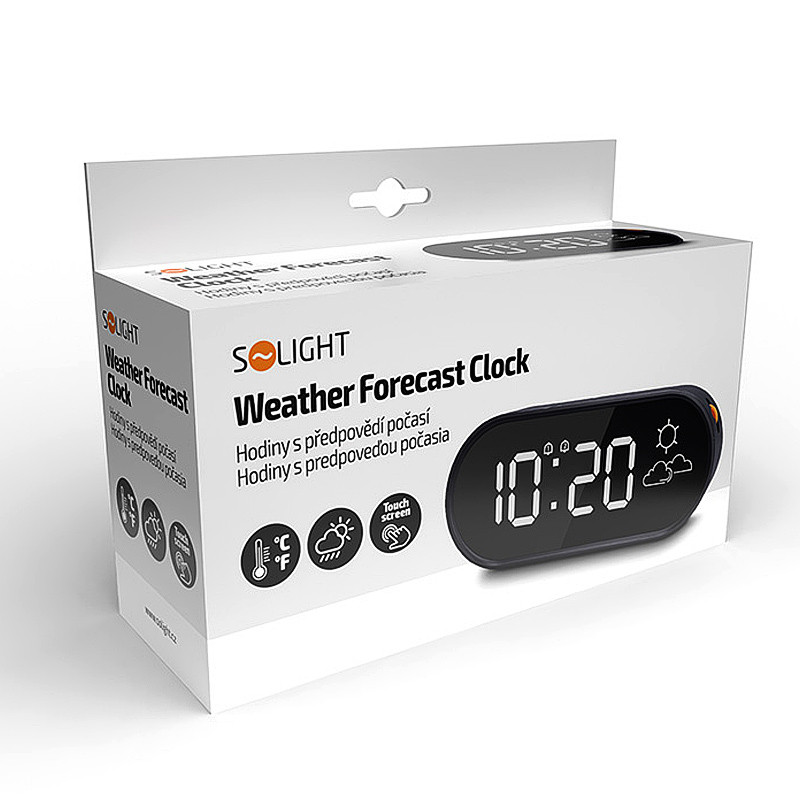 Hodiny s predpoveďou počasia s budíkom a nabíjaním cez USB. Tieto moderné digitálne hodiny s funkciou predpovede počasia na základe zmien atmosférického tlaku kombinuje štýlový dizajn s dotykovým ovládaním. Displej umožňuje zobrazenie času alebo striedanie času a teploty. Budík s funkciou odloženia budenia zabezpečuje pohodlné budenie.