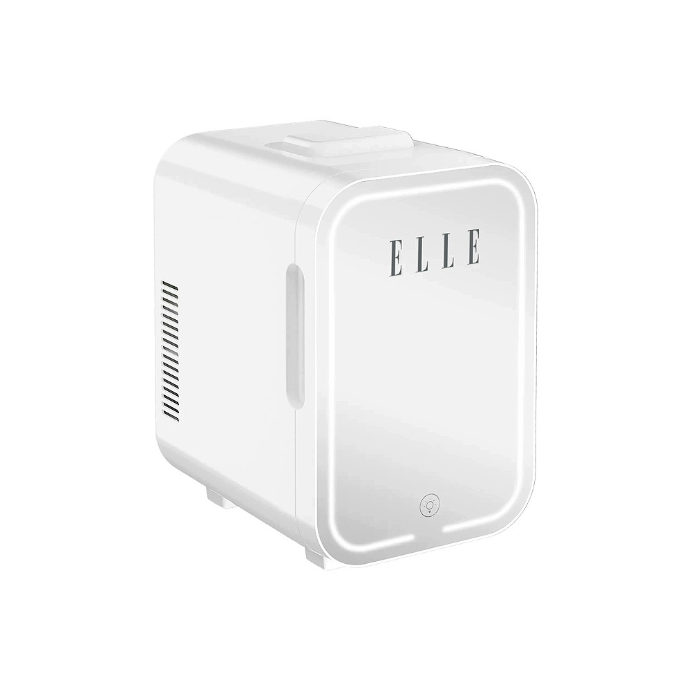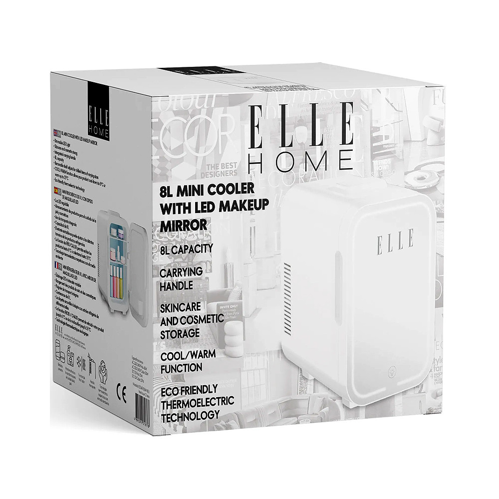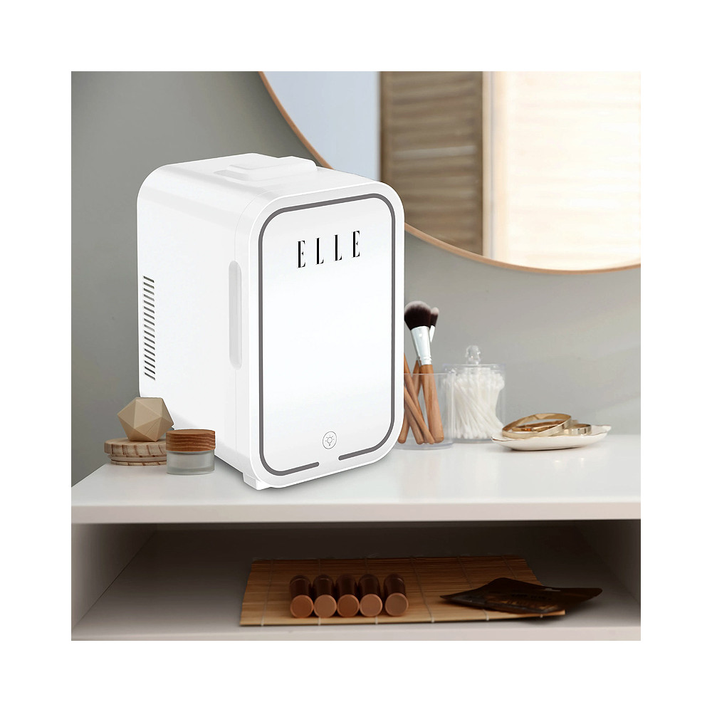 Kozmetická chladnička s LED makeup zrkadlom 8L Biela. Pozdvihnite svoj osobný priestor s chladiacou taškou na kozmetiku ELLE, ktorá je dokonalým štýlovým doplnkom. Jej veľkorysý 8-litrový objem poskytuje extra priestor na viac chladených nápojov, teplých produktov alebo perfektne uskladnených kozmetických potrieb a kozmetiky.