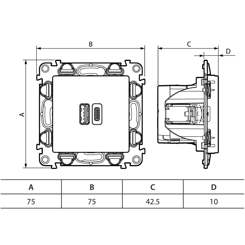 Pre nabíjanie prenosných zariadení ako sú telefóny, smartfóny, tablety, MP3 alebo MP4 prehrávače, reproduktory, hodinky, hráčske konzoly, powerbanky. USB nabíjanie: 5 V / 3.0 A • 1 USB typ-A + 1 USB typ-C.