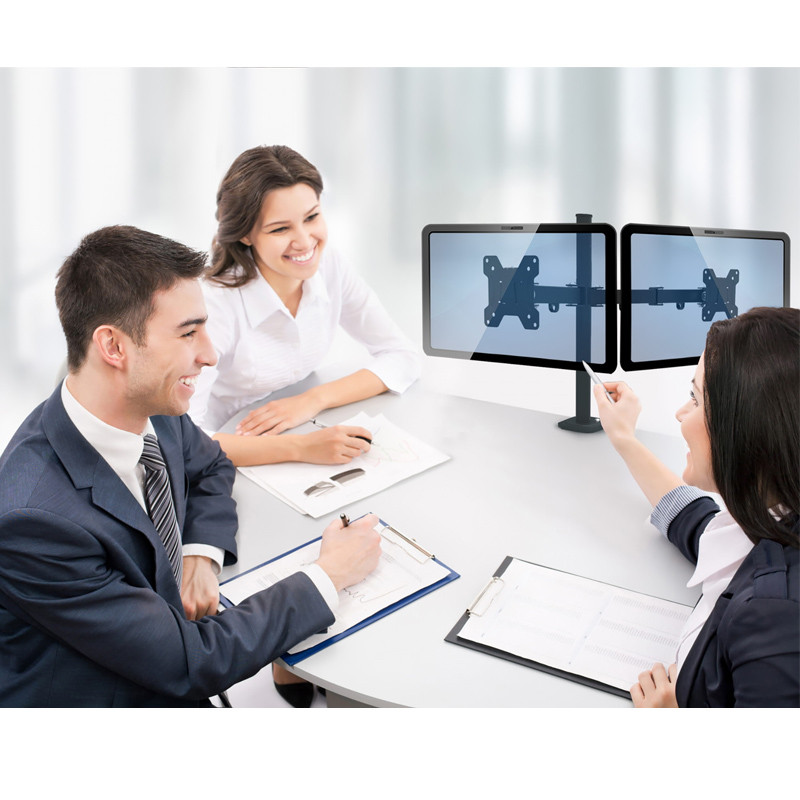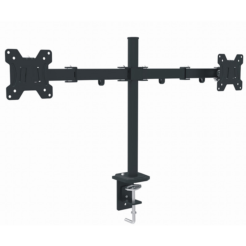 Držiak na stôl pre 2 LCD monitory, natáčateľný a naklápateľný - pre 2 obrazovky veľkosti 13"-27" • VESA (100x100 mm) kompatibilný • max.váha obrazovky: 8 kg • vedenie káblov • farba: čierna