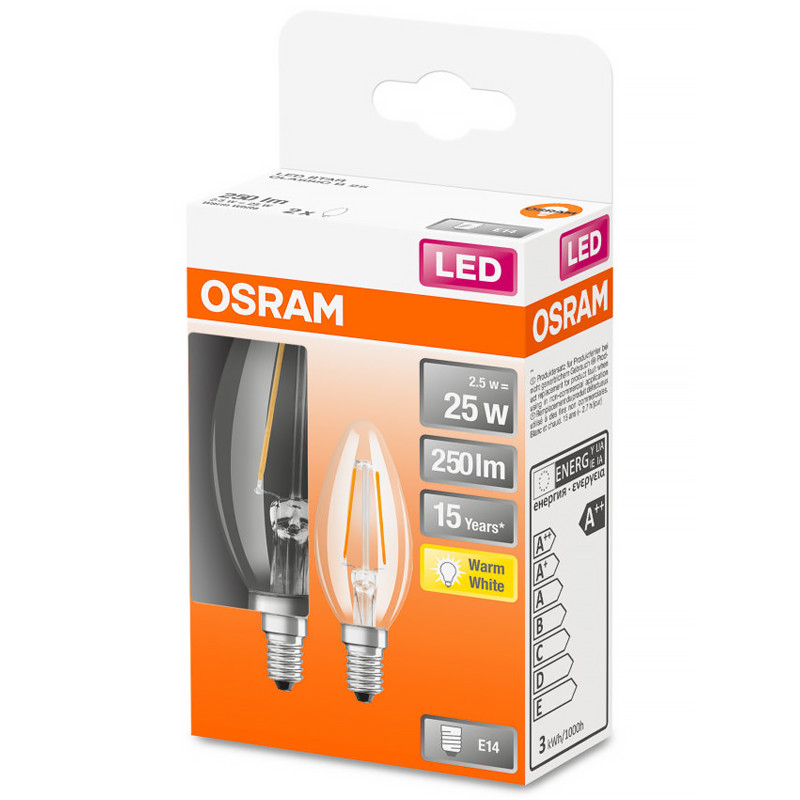 - Sada 2ks Osram LED sviečok Classic B 2,5W teplá biela E14 slúži ako ideálna náhrada za klasické žiarovky.