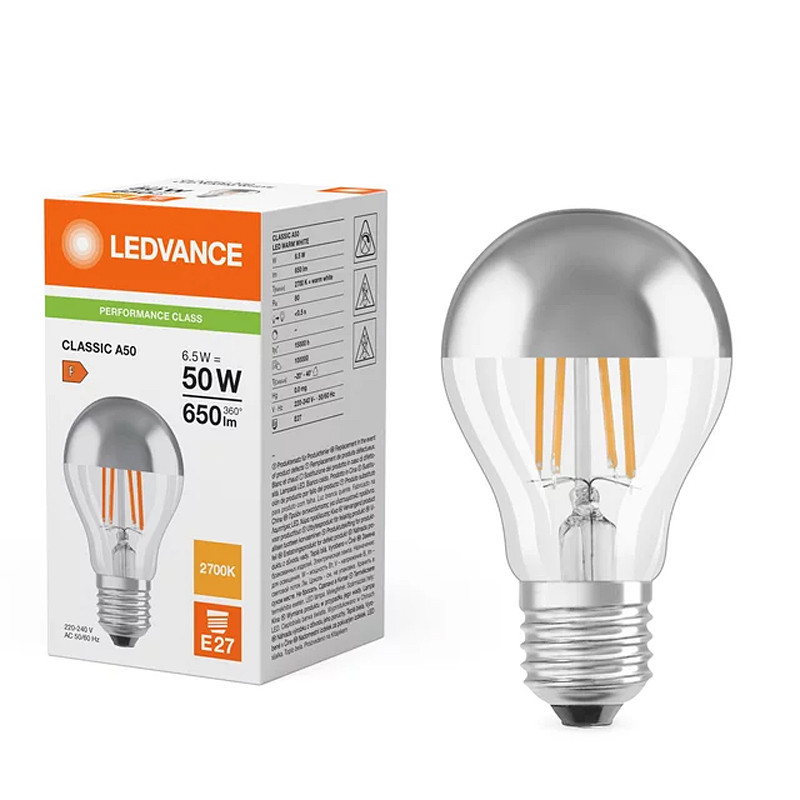 Žiarovka LEDVANCE LED CLA50MIR S E27 6,5W/827 MIRROR SILVER PMC