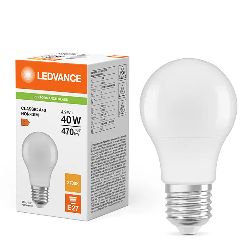 LED žiarovka, matná, tradičný tvar - pätica: E27 • výkon: 4,9 W • ekvivalent: 40 W • svetelný tok: 470 lm • teplá biela (2700K) • napätie: 220-240V • stmievateľné: nie • uhol lúča: 180° • celková dĺžka: 107 mm • priemer: 60 mm