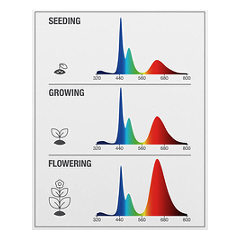 - Nastaviteľné pre 3 rôzne fázy rastu kvetov a zeleniny: siatie, pestovanie a kvitnutie