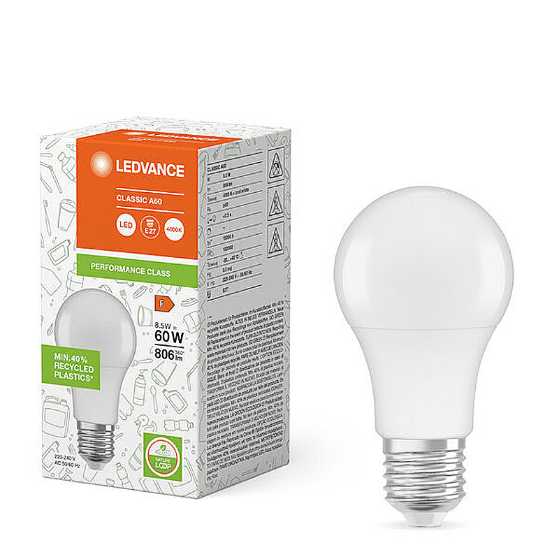 Žiarovka LEDVANCE LED PCR CLA60 E27 8,5W/840 PMC Recycled Plastic