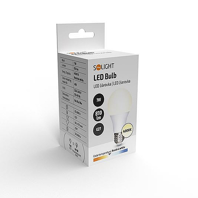 LED žiarovka, klasický tvar - výkon: 7W • pätica: E27 • farba svetla: Neutrálna biela (4000K) • uhol lúča: 270° • svetelný tok: 810 lm • ekvivalent: 60W