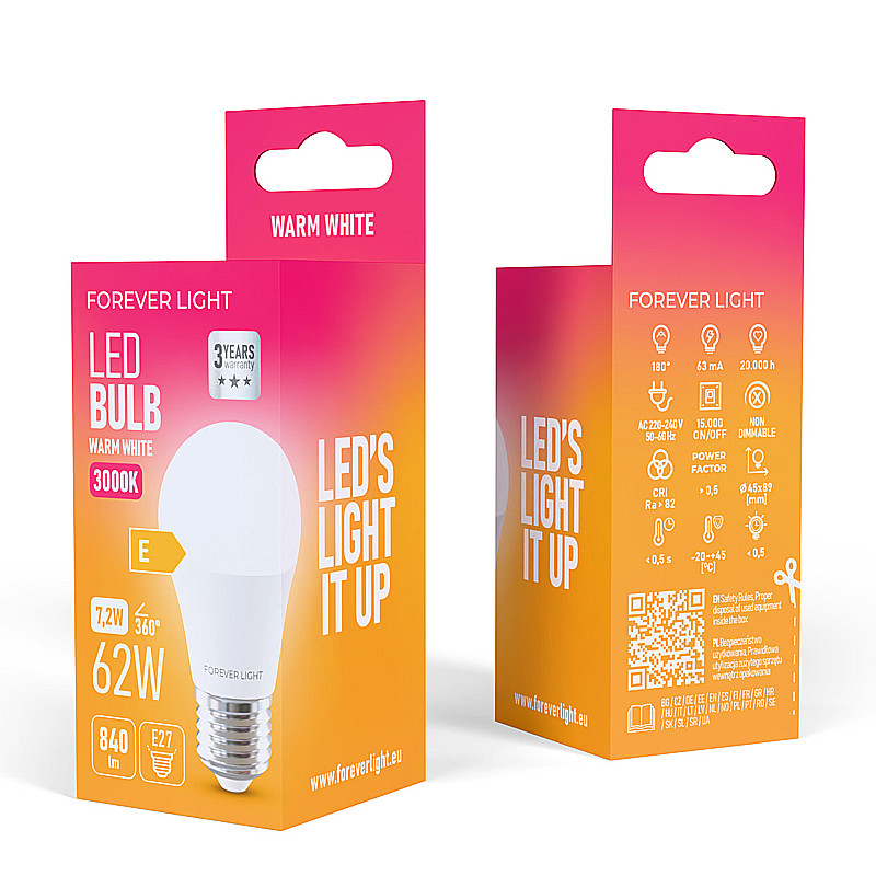 LED žiarovky Forever Light so závitom E27 ponúkajú široký rozsah energeticky efektívnych riešení, ktoré vyhovujú rôznym potrebám používateľov. Ponuka zahŕňa model G45 s výkonom 7,2W a svetelným prúdom 840 lm. To umožňuje zákazníkom vybrať si produkt, ktorý presne zodpovedá veľkosti a charakteru miestnosti.