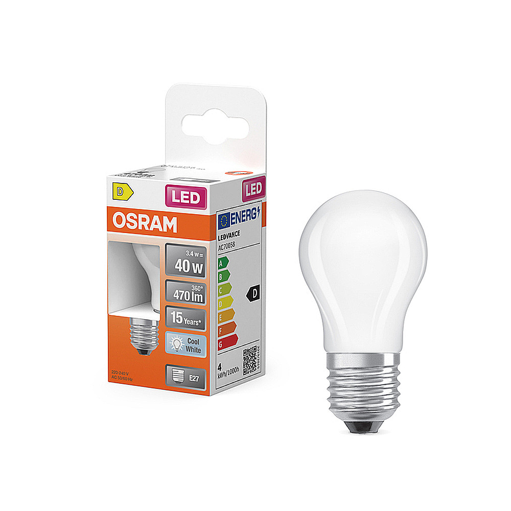 LED žiarovka, ilumka - pätica : E27 • výkon: 3,4 W • ekvivalent: 40 W • napätie: 220-240V • svetelný tok: 470 lm • farba svetla: Neutrálna biela (4000 K) • uhol lúča: 300° • prevedenie: matné • celková dĺžka: 84 mm • priemer: 45 mm
