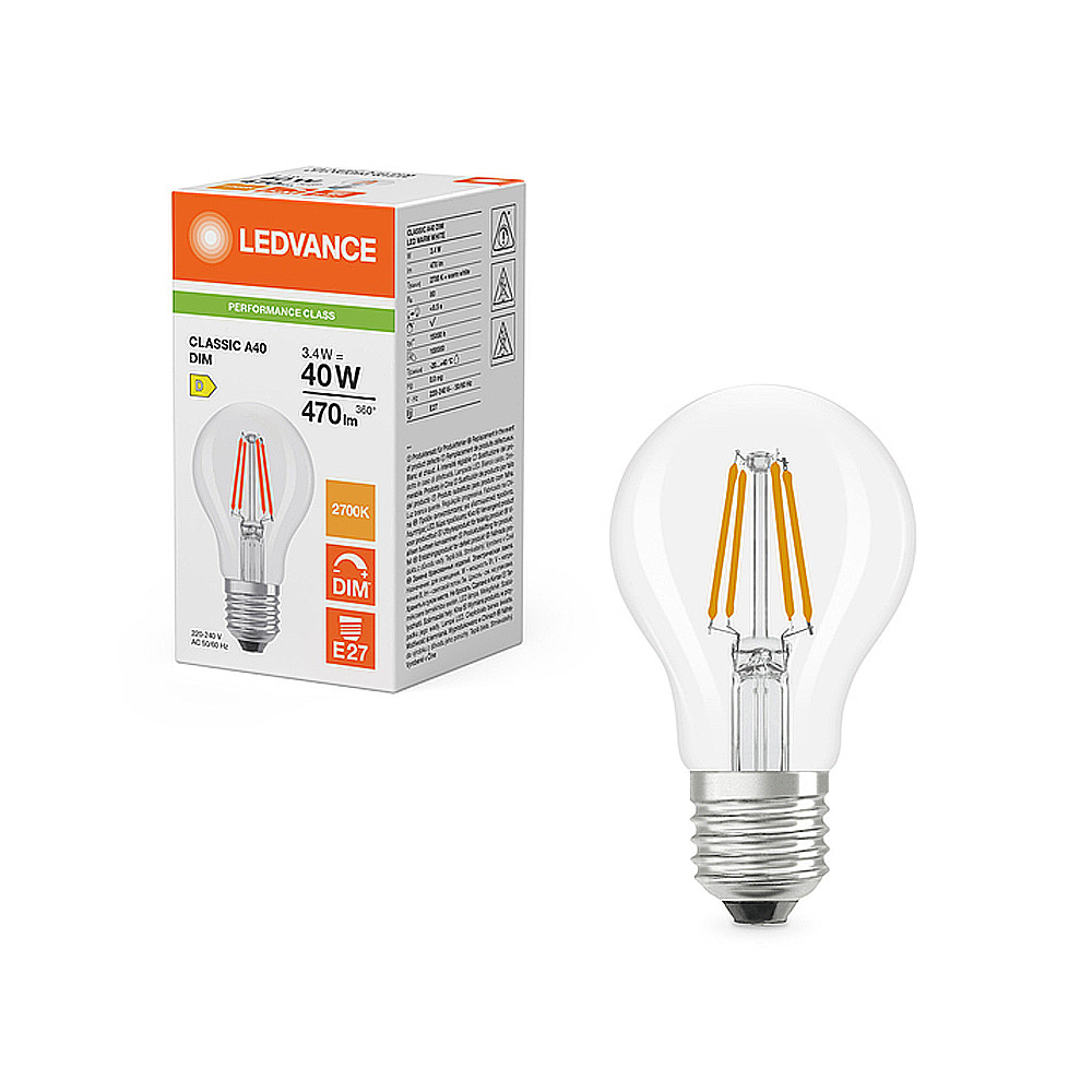 LED žiarovka, číra, tradičný tvar - pätica: E27 • výkon: 3,4 W • ekvivalent: 40 W • svetelný tok: 470 lm • Teplá biela (2700K) • napätie: 220-240V • stmievateľné: áno • uhol lúča: 320° • celková dĺžka: 105 mm • priemer: 60 mm