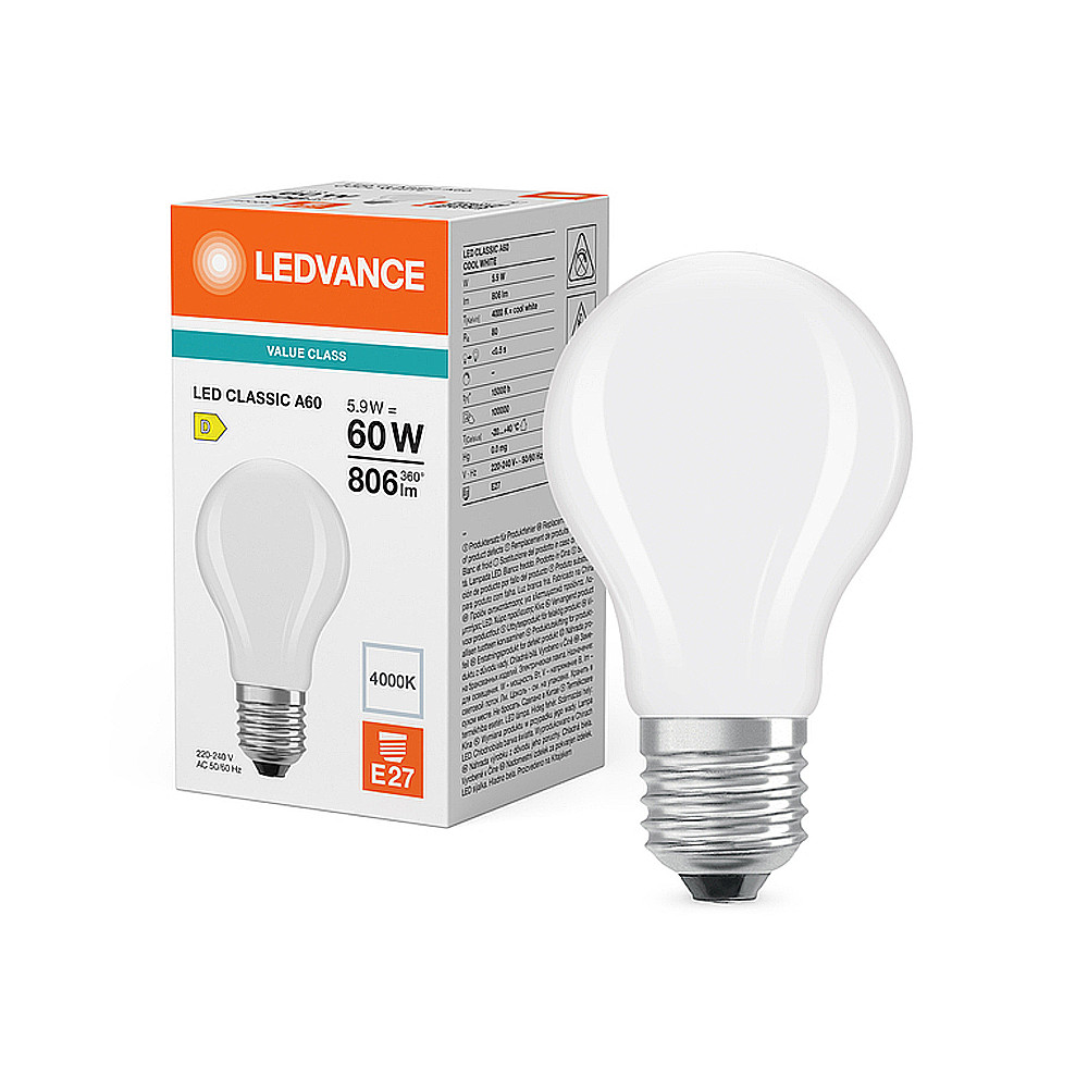 Vysokoefektívna LED žiarovka, klasický tvar - pätica: E27 • výkon: 5,9 W • ekvivalent: 60 W • svetelný tok: 806 lm • neutrálna biela (4000K) • napätie: 220-240V • stmievateľné: nie • uhol lúča: 300° • prevedenie: matné • celková dĺžka: 105 mm • priemer: 60 mm