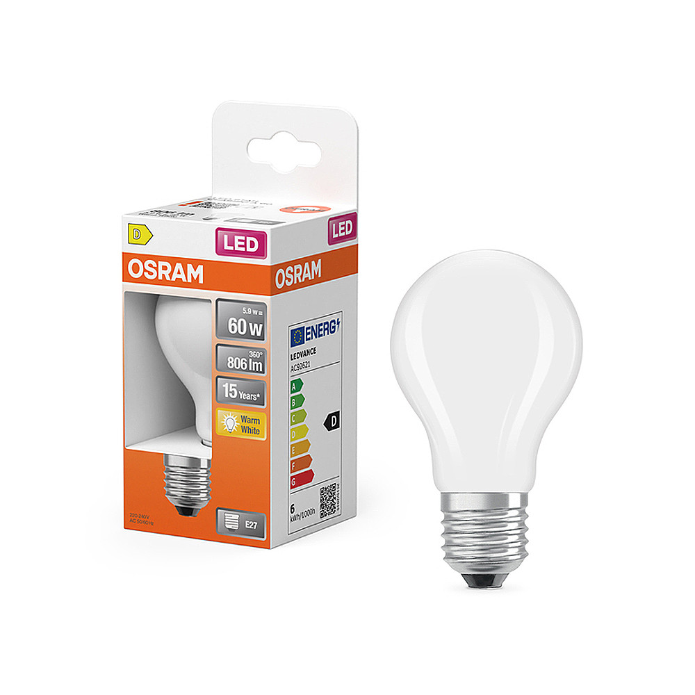 Vysokoefektívna LED žiarovka, klasický tvar - pätica: E27 • výkon: 5,9 W • ekvivalent: 60 W • svetelný tok: 806 lm • Teplá biela (2700K) • napätie: 220-240V • stmievateľné: nie • uhol lúča: 300° • prevedenie: matné • celková dĺžka: 105 mm • priemer: 60 mm