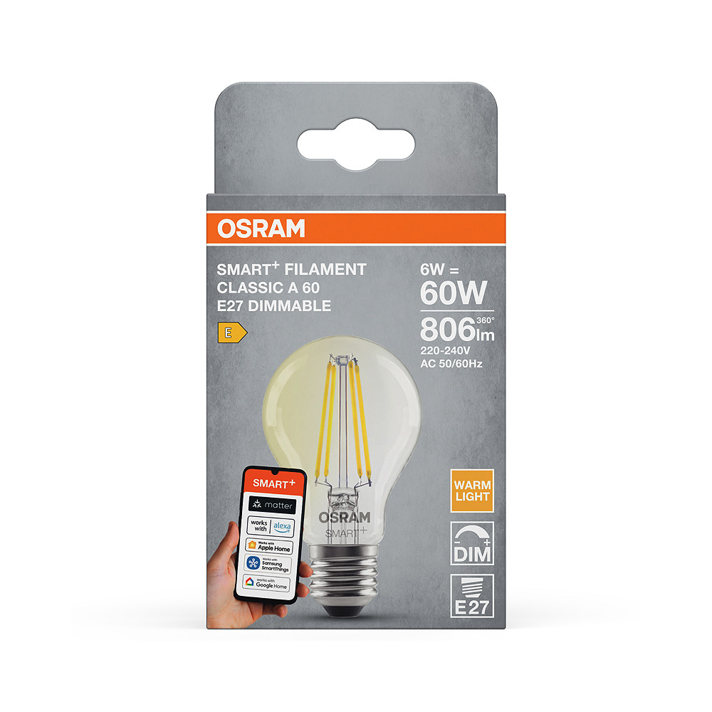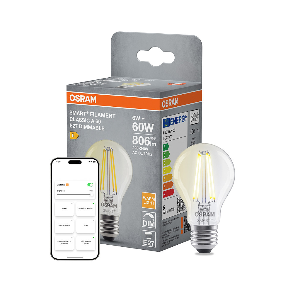 Smart WiFi LED žiarovka, nastaviteľný jas - pätica: E27 • výkon: 6 W • ekvivalent: 60 W • svetelný tok: 806 lm • farba svetla: Teplá biela (2700K) • napätie: 220-240V • stmievateľné: áno • dĺžka: 105 mm • priemer: 60 mm