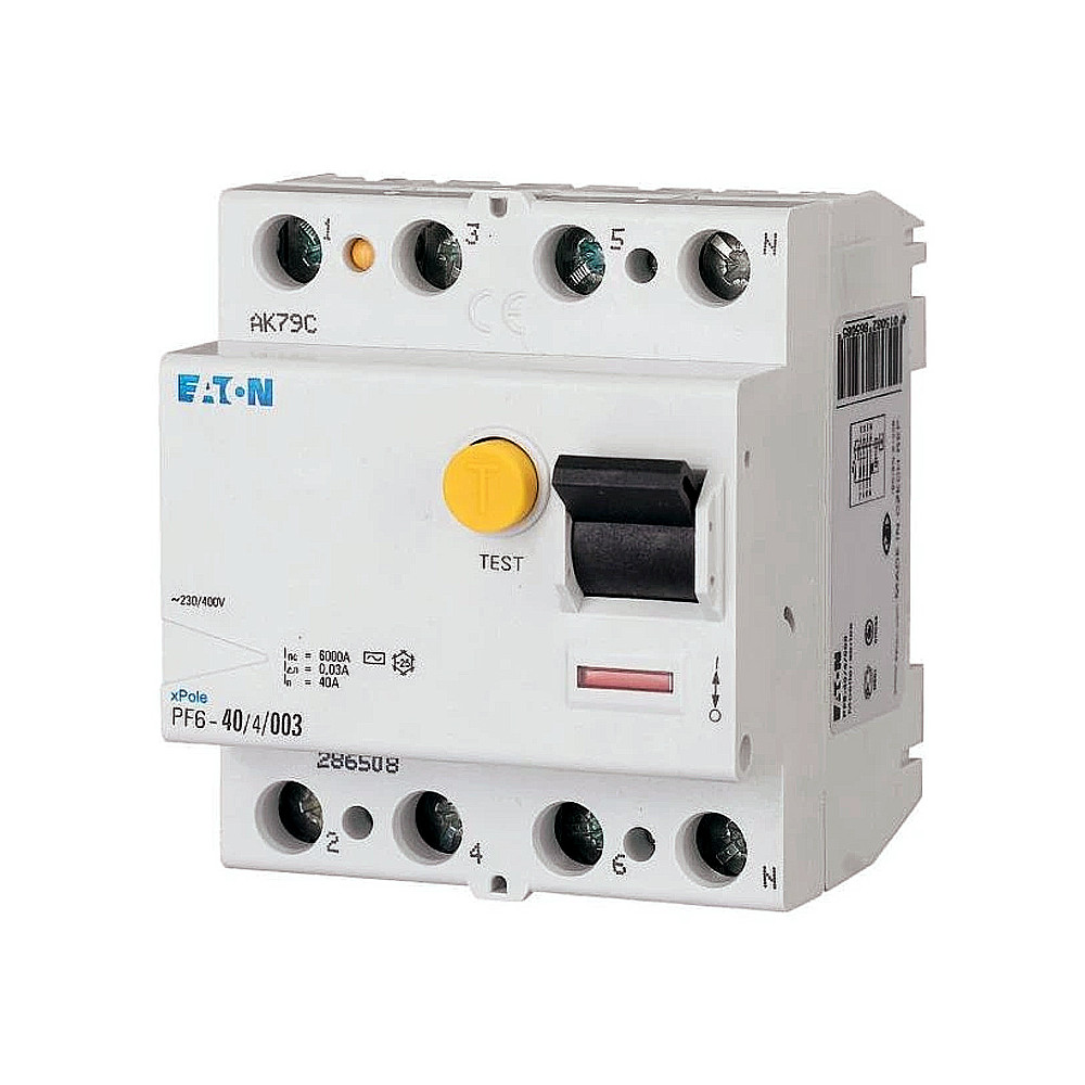 Tento 4-pólový prúdový chránič Eaton série PF6 je určený pre trojfázové obvody s odberom do 25 A. S citlivosťou 30 mA chráni osoby pred úrazom elektrickým prúdom a majetok pred požiarom. Verzia Typ A je nevyhnutná pre moderné inštalácie, pretože detekuje aj pulzujúce DC prúdy, ktoré bežný typ AC nezachytí.
