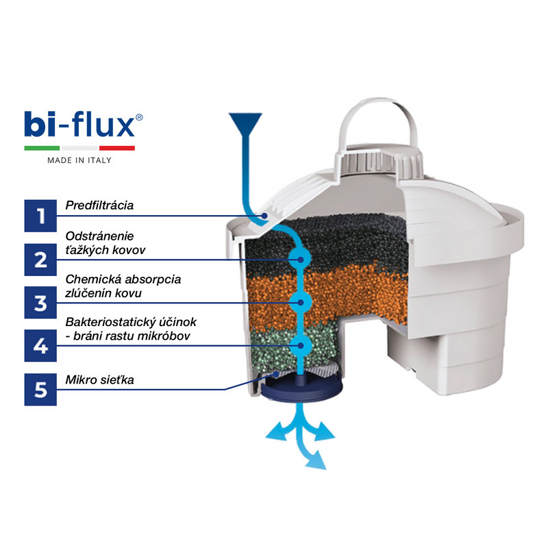 Súčasťou každej filtračnej kanvice je patentovaný filter Bi-flux s 5-stupňovou technológiou filtrácie. Jedna filtračná patróna dokáže prefiltrovať až 150 l vody z kohútika. To je presne 100 bežných PET fliaš. Bi-flux filter redukuje v kohútikovej vode ťažké kovy, obsah chlóru, prípadné herbicídy a pesticídy. Zlepšuje chuť a vôňu vody. Efektívne redukuje vodný kameň. Vďaka tomu sa odporúča používať filtrovanú vodu napr. v žehličkách alebo kávovaroch, čím sa predlžuje ich životnosť.