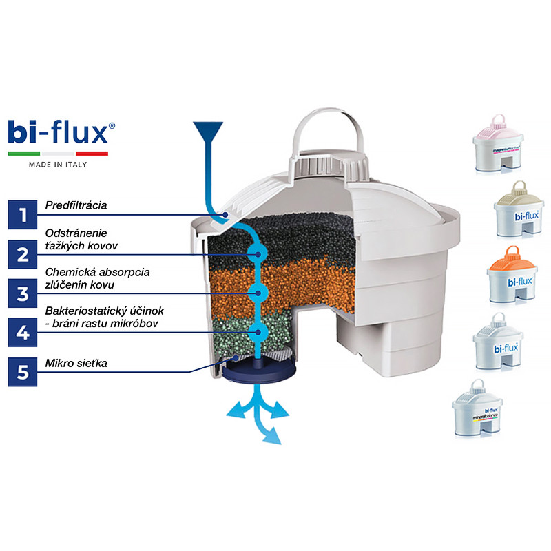 - Bi-flux filter redukuje ťažké kovy, chlór, vodný kameň herbicídy aj pesticídy