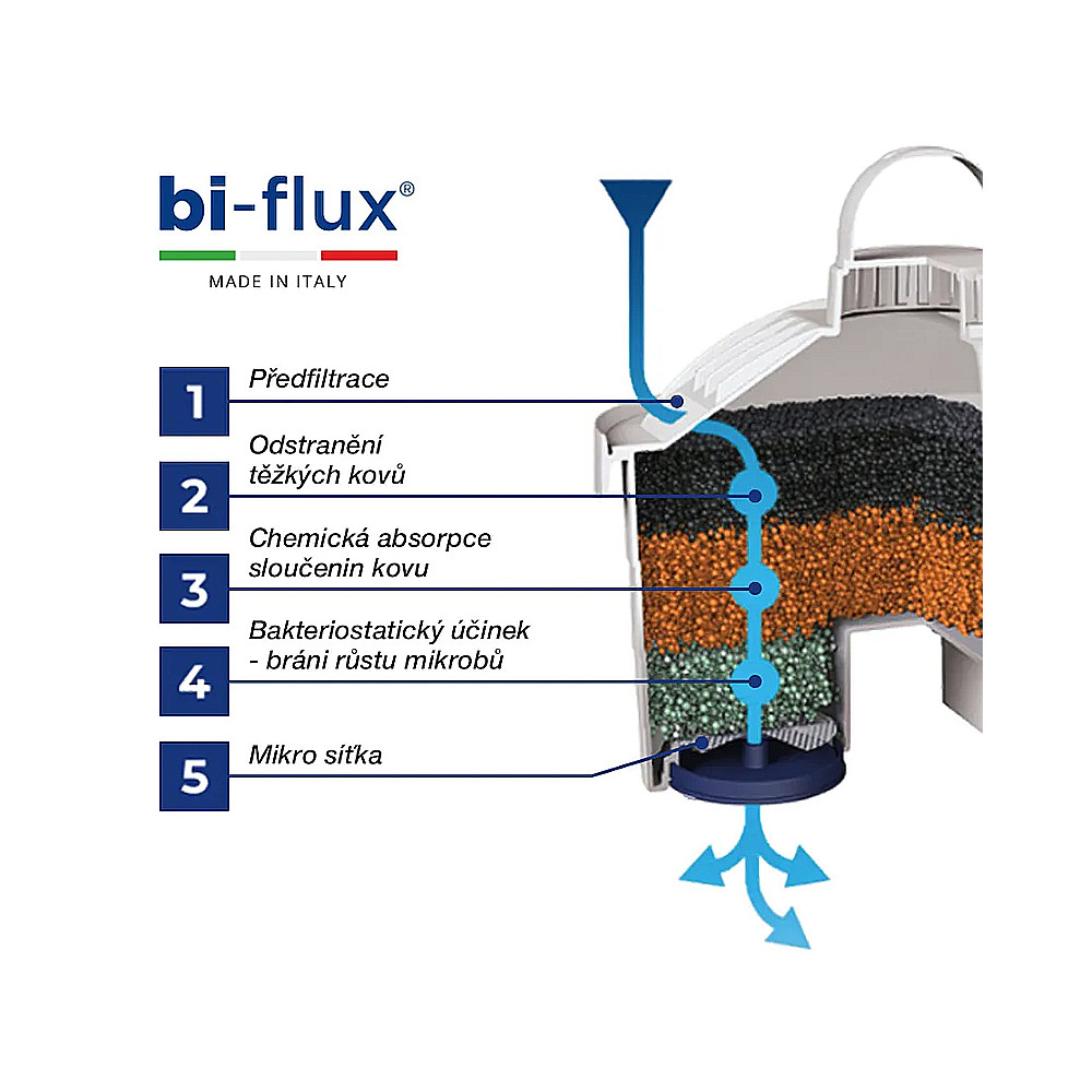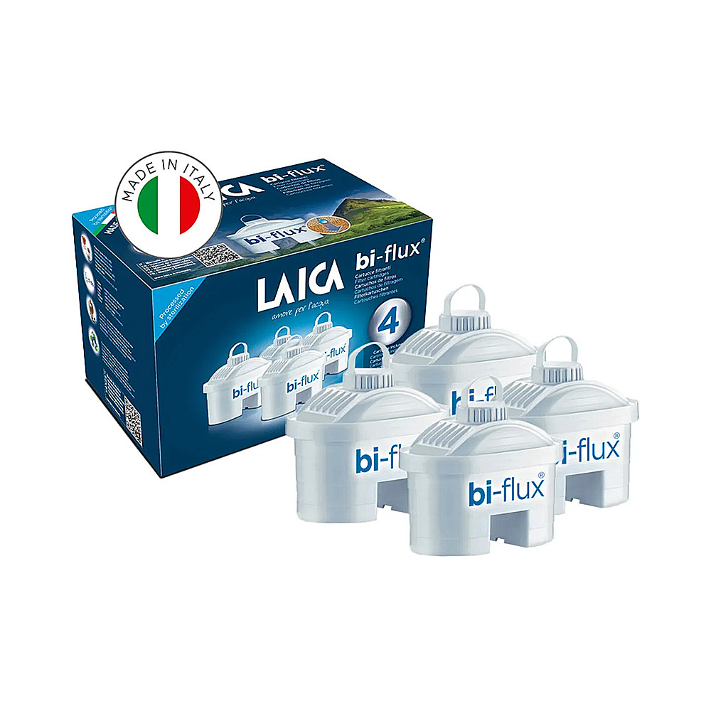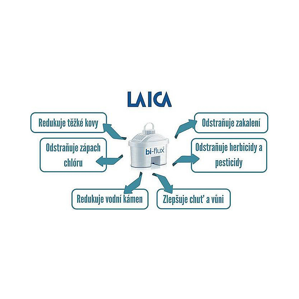 Filtračná patróna na vodu Bi-flux s 5-stupňovou technológiou je nepostrádateľnou súčasťou každej filtračnej kanvice LAICA. Jedna filtračná patróna dokáže prefiltrovať až 150 l vody z kohútiku. To je presne 100 bežných PET fliaš. Bi-flux filter navyše zbavuje kohútikovú vodu chlóru, prípadných herbicídov a pesticídov, ťažkých kovov, a navyše zlepšuje chuť a vôňu vody. Efektívne redukuje vodný kameň. Vďaka tomu sa ju odporúča používať napríklad v žehličkách alebo kávovaroch, čím predlžuje ich životnosť.
