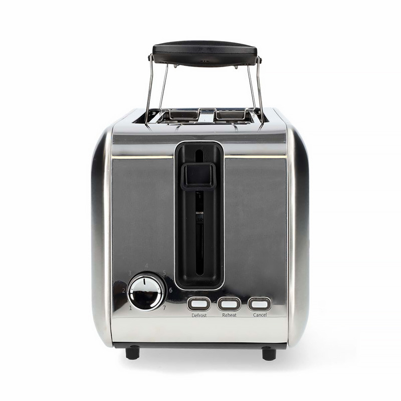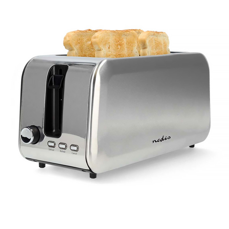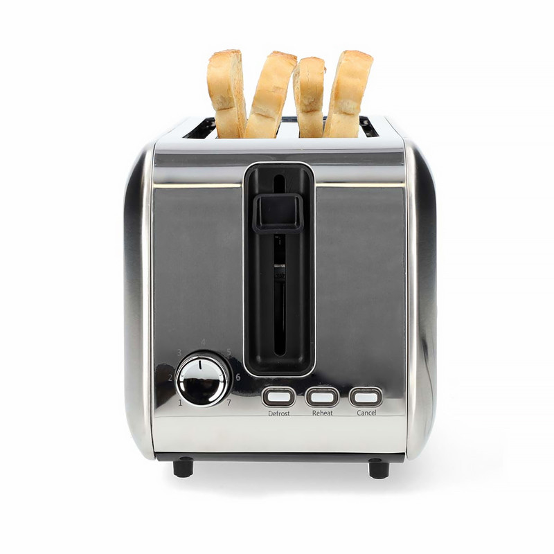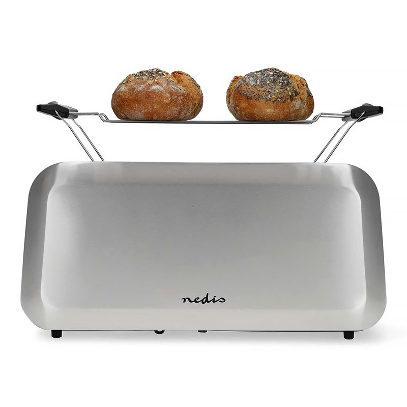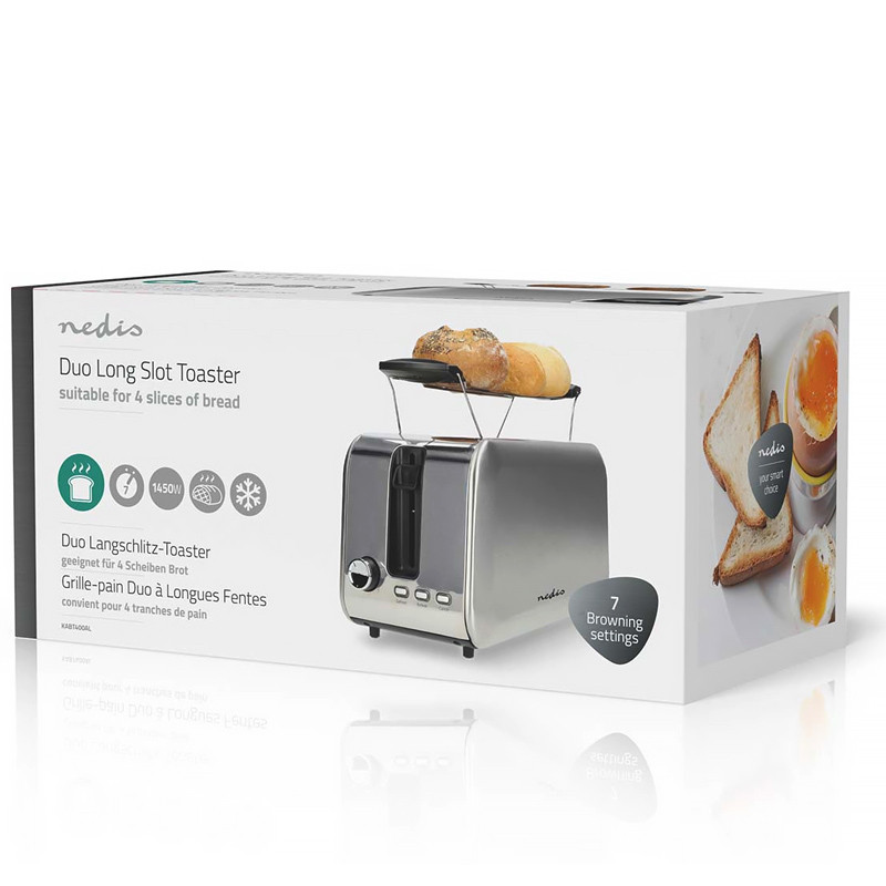 Nerezový 1 450W hriankovač, ktorý pojme až 2 dlhé plátky chleba naraz, alebo dokonca 4 krajce sendvičového chleba (10x10 cm) súčasne, ponúka 7 úrovní opekania, funkciu rozmrazovania a dopekania.