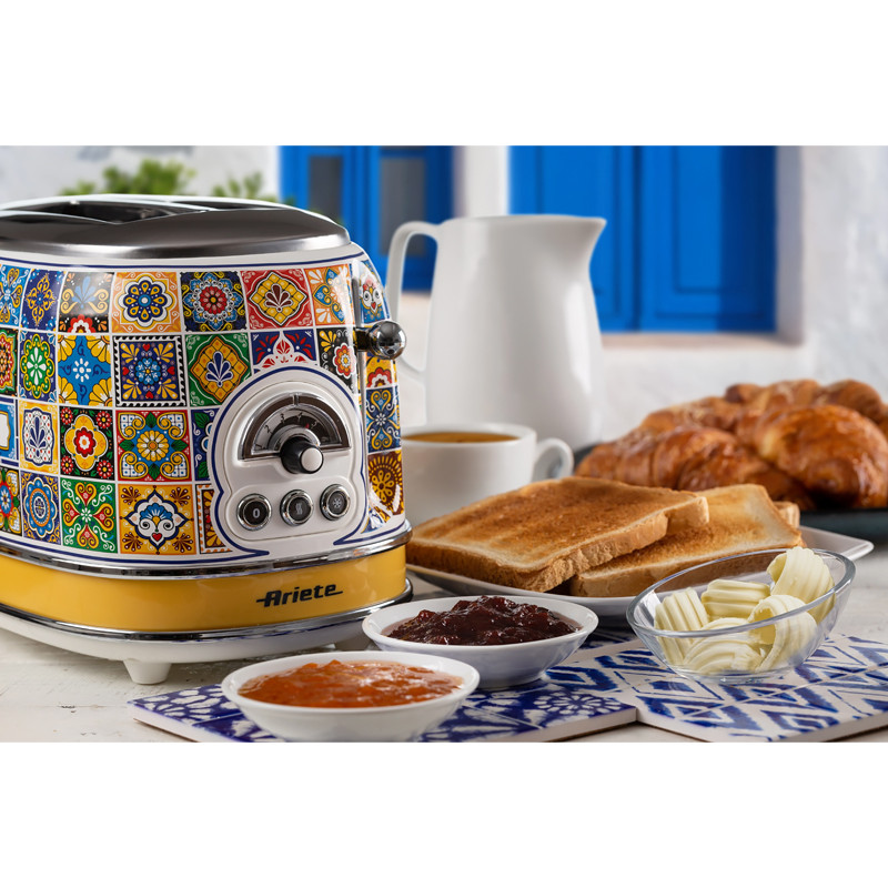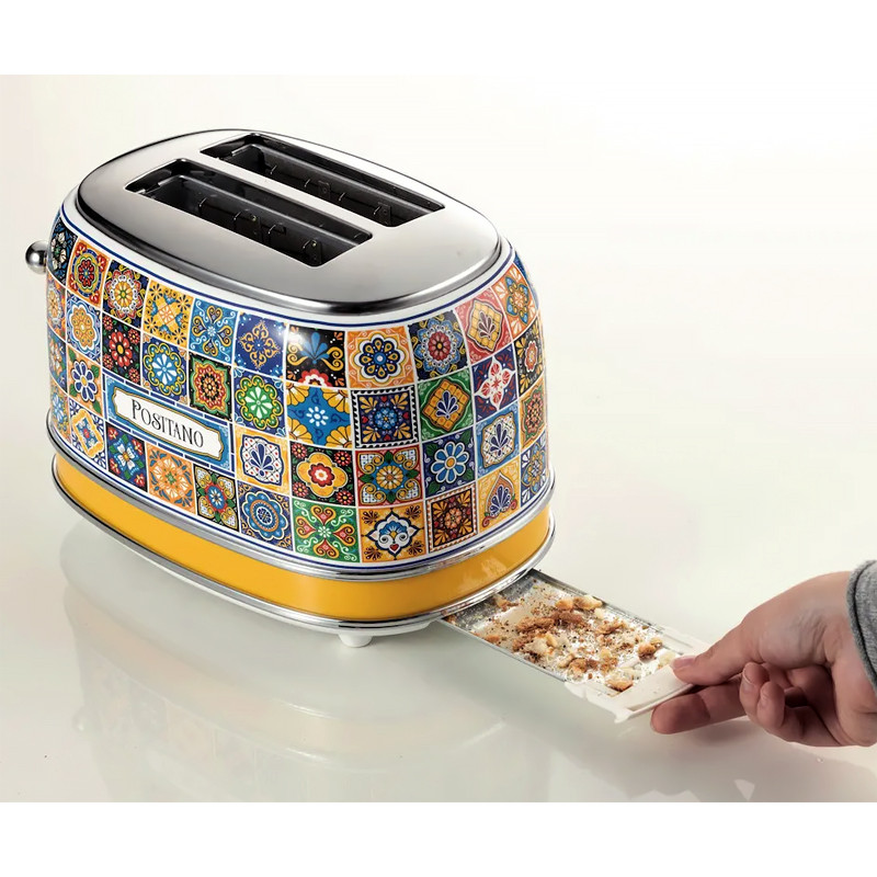 Štýlový hriankovač na dve hrianky v dizajne tradičnej pestrofarebnej keramiky z juhotalianskeho Positana vo vás každé ráno prebudí radosť a hravosť. Tento hriankovač ľahko a rýchlo pripraví perfektne prepečené hrianky pre každého. Vďaka šiestim úrovniam opekania vám ich prichystá presne tak, ako to máte radi. Samozrejmosťou je aj funkcia rozpekania mrazeného pečiva. Hriankovač má automatické vysunutie a vyberateľnú misku na omrvinky pre jednoduchú údržbu.