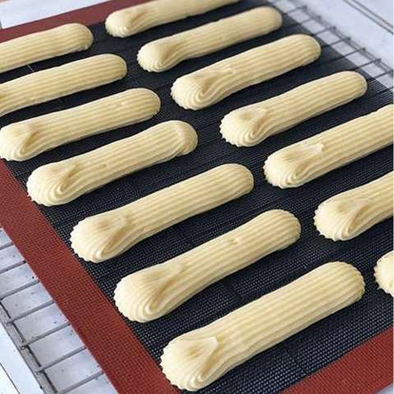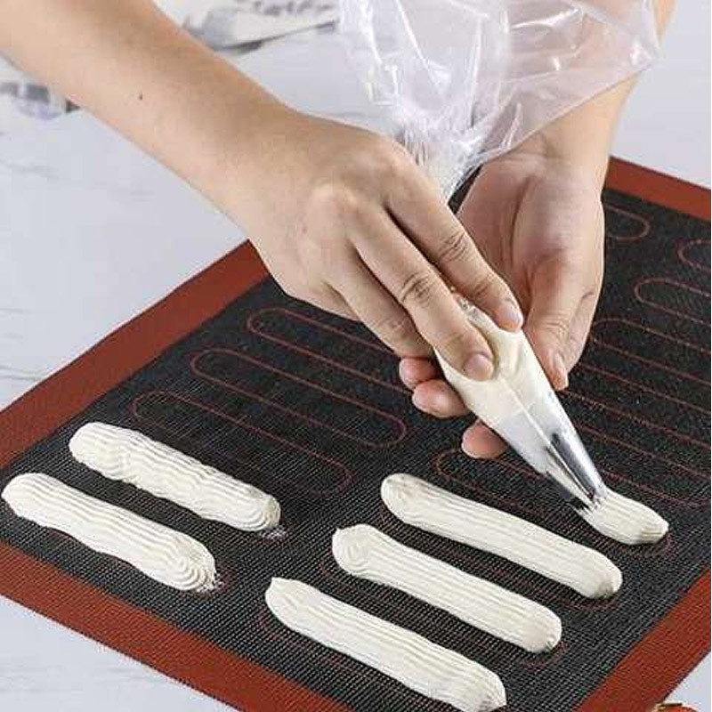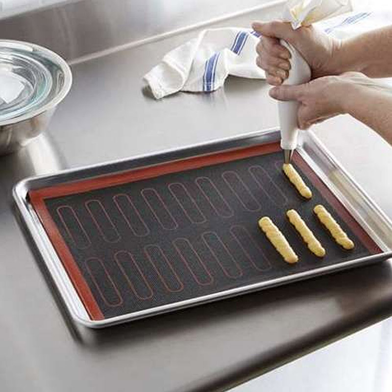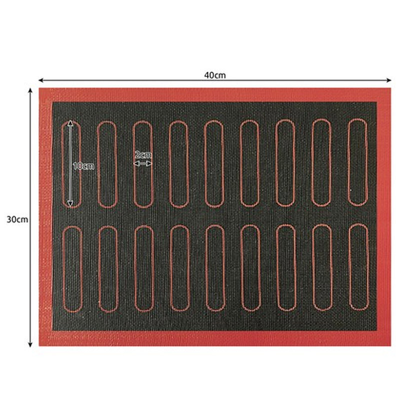 OBOJSTRANNÁ – podložka je obojstranná. Na jednej strane je vytlačený vzor "podlhovastého" zákusku ale, ktorý uľahčuje roztieranie cesta. Druhá strana je bez vzoru. Štruktúra podložky je protišmyková, nekĺže sa po doske, plechu na pečenie ani pri nanášaní cesta.