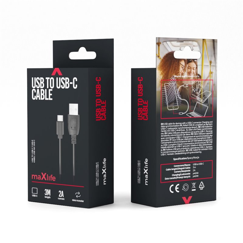 Kábel USBA-USBC 3m 2A MAXLIFE OEM0100972 čierny