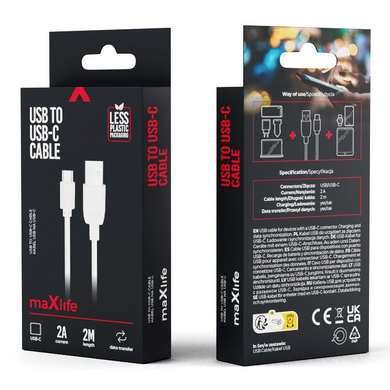 Kábel značky Maxlife s USB-C konektorom, dĺžka 2m. Ak máte viacero zariadení ako sú reproduktory, powerbanka, slúchadlá, smartfón a hľadáte kábel na ich nabitie alebo zabezpečenie efektívneho prenosu dát, potom je tento kábel ideálny. Kábel sa odporúča najmä pre novšie modely smartfónov. Podporuje možnosť rýchleho nabíjania. Veľkou výhodou je jeho flexibilita, vďaka čomu je mimoriadne funkčný a pohodlný na používanie. Robustné vyhotovenie zaisťuje správnu a dlhotrvajúcu funkciu.