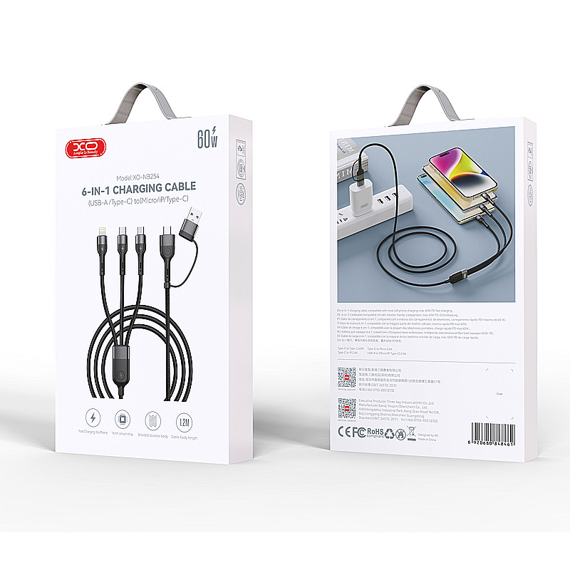 Kábel USBA/USBC-IPHONE/USBC/USBB micro 6v1 1,2m 60W čierny XO NB254