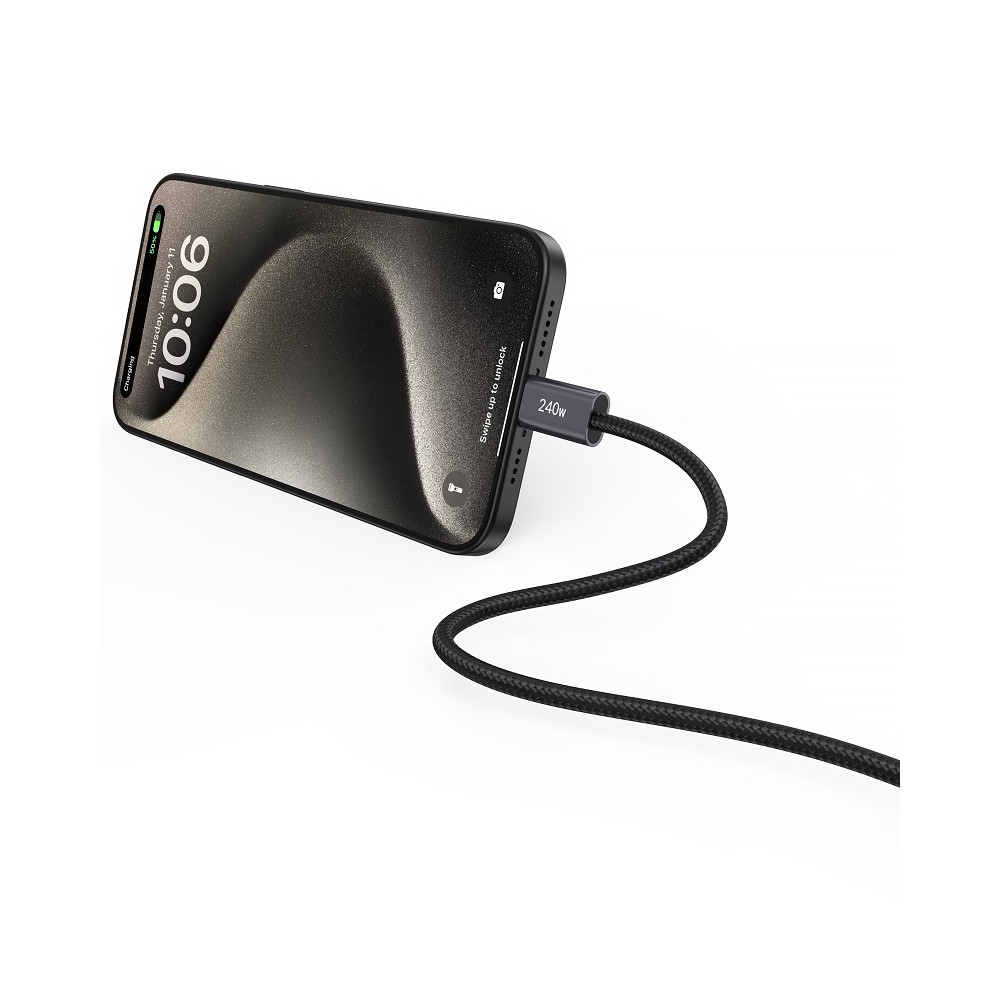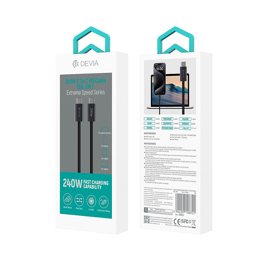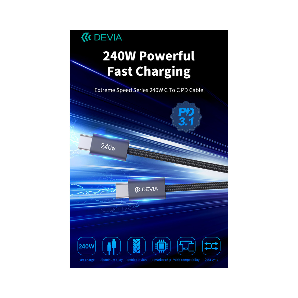 Kábel Devia Extreme 240W predstavuje silnú dávku energie pre vaše zariadenia. Inteligentný čip prispôsobuje napätie zariadeniu a zaisťuje bezpečné nabíjanie. Široká kompatibilita umožňuje nabíjať telefón, notebook, tablet alebo konzolu.Rýchlosť prenosu dát je 480 Mbps. Súbor s veľkosťou 1 GB sa prenesie za 30 sekúnd.Kábel je potiahnutý opletením z nylonových vlákien. Je odolný, odolný voči praskaniu a nezamotáva sa.