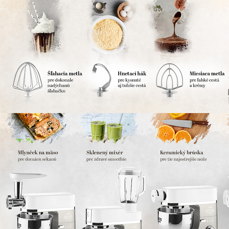 Medzi príslušenstvom nájdete tiež 3 druhy nadstavcov – šľahacia, miešacia metla a hnetací hák. Hutné cesto na chlieb aj dokonale nadýchanú šľahačku máte hotovú raz dva.