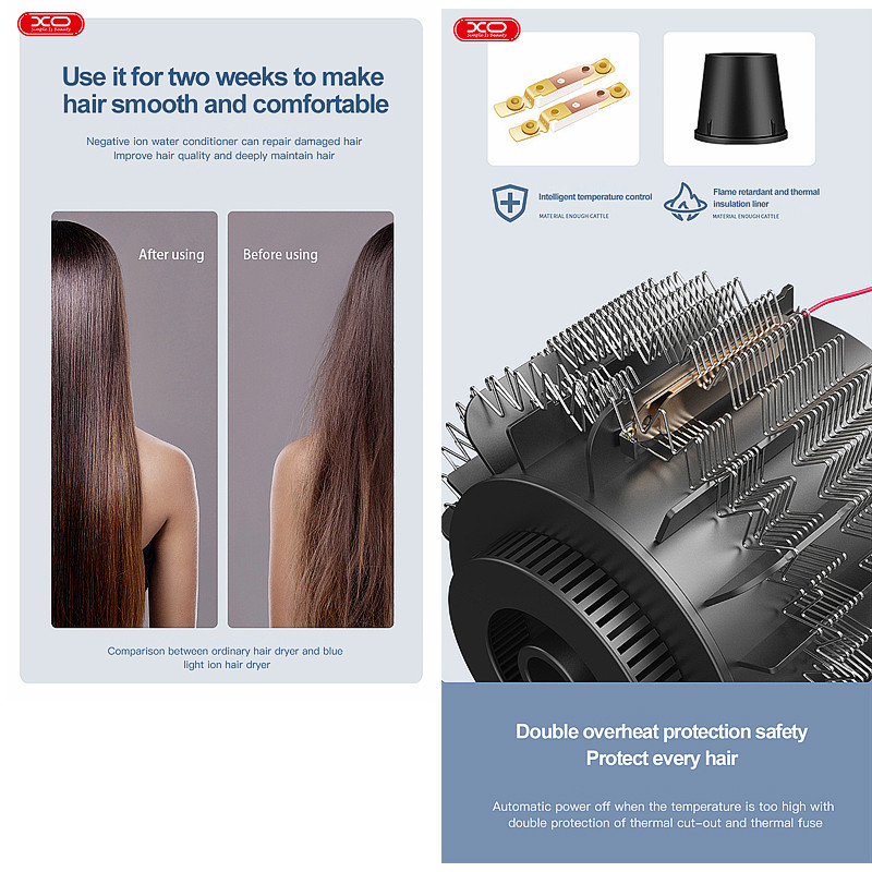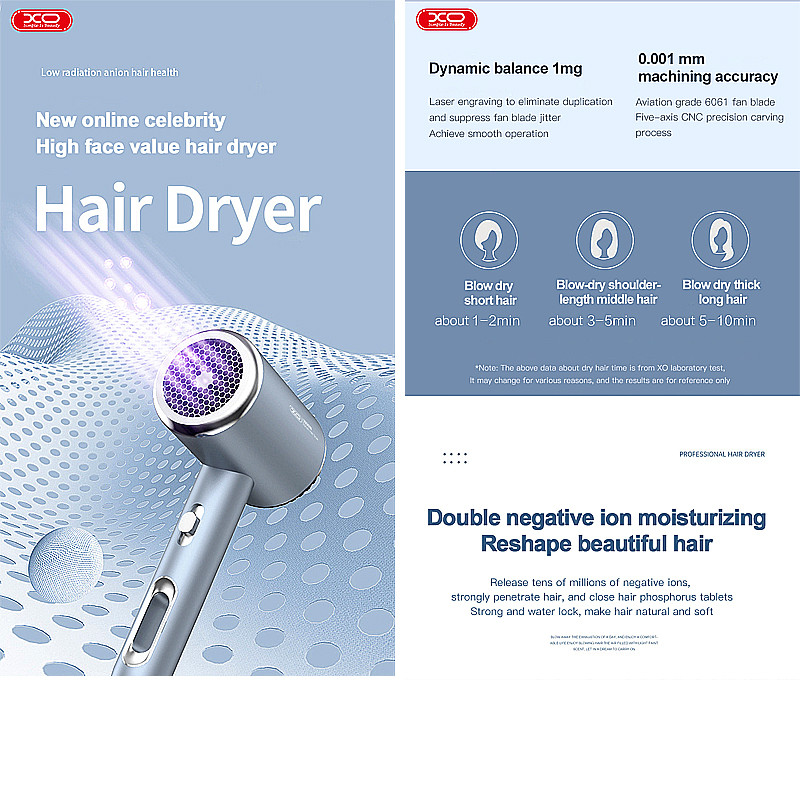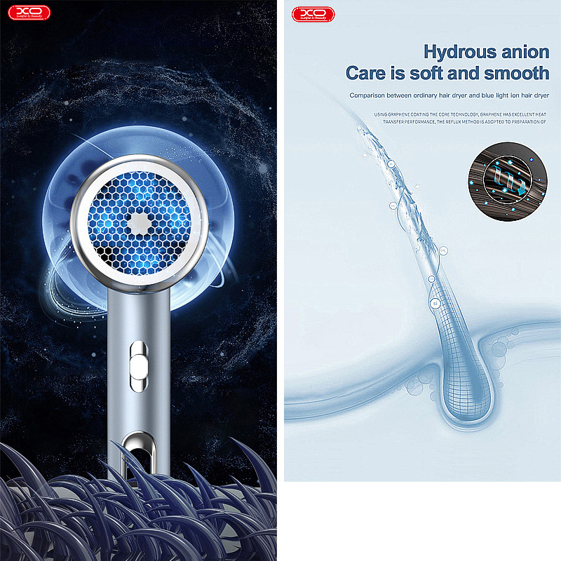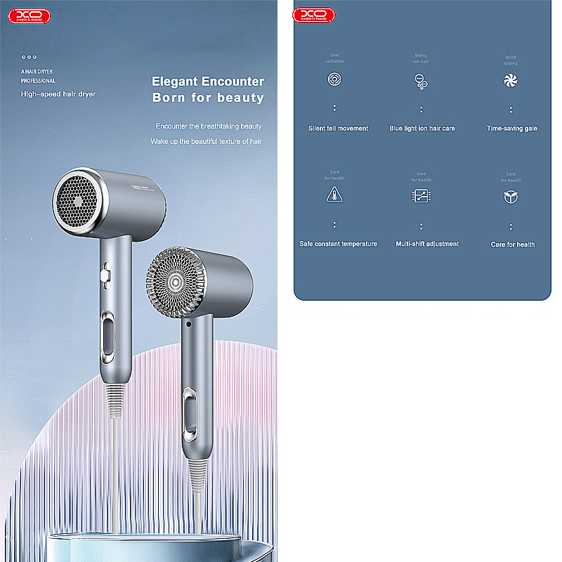XO CF2 je fén s ionizáciou. Funkcia horúceho a studeného prúdenia vzduchu pomôže postarať sa o lepší stav vlasov. Teplejší prúd vzduchu bude užitočný vždy, keď ich chcete rýchlo a efektívne vysušiť. Ukončenie sušenia studeným prúdom vzduchu zabezpečí, že naša účes bude hladký, lesklý a lepšie fixovaný. Má to tiež pozitívny vplyv na štruktúru vlasov.