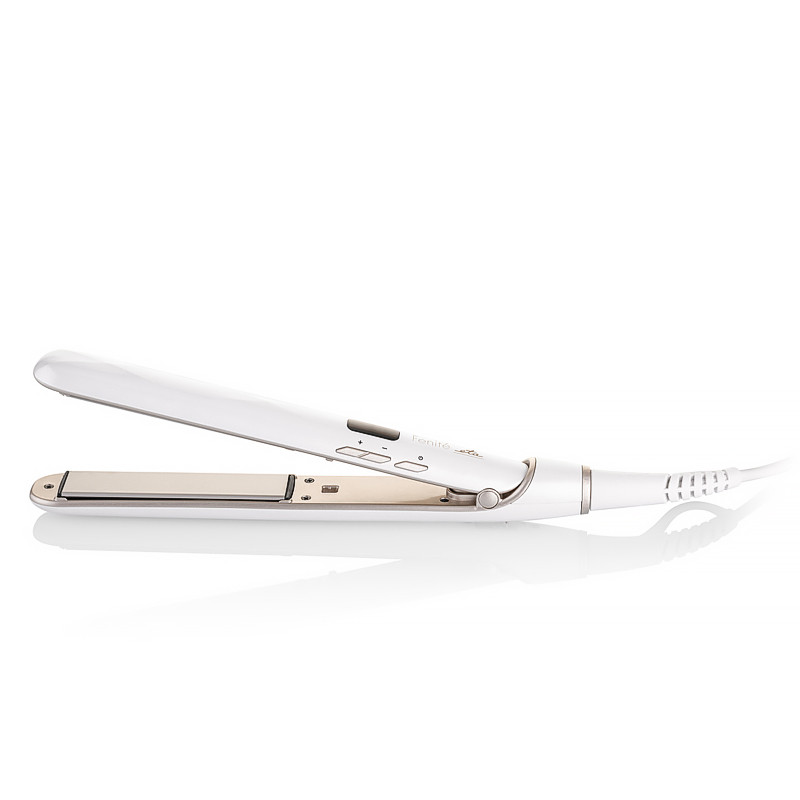 Tajomstvo perfektne rovných vlasov tkvie v odpružených doštičkách s keramickým povrchom, ktoré k povrchu vlasu perfektne priľnú. Širokú teplotnú škálu v rozsahu 150–230 °C potom jednoducho prispôsobíte typu vlasov a miere ich poddajnosti. K tomu slúžia ľahko prístupné tlačidlá +/-, ktoré teplotu regulujú v krokoch po 10 °C.