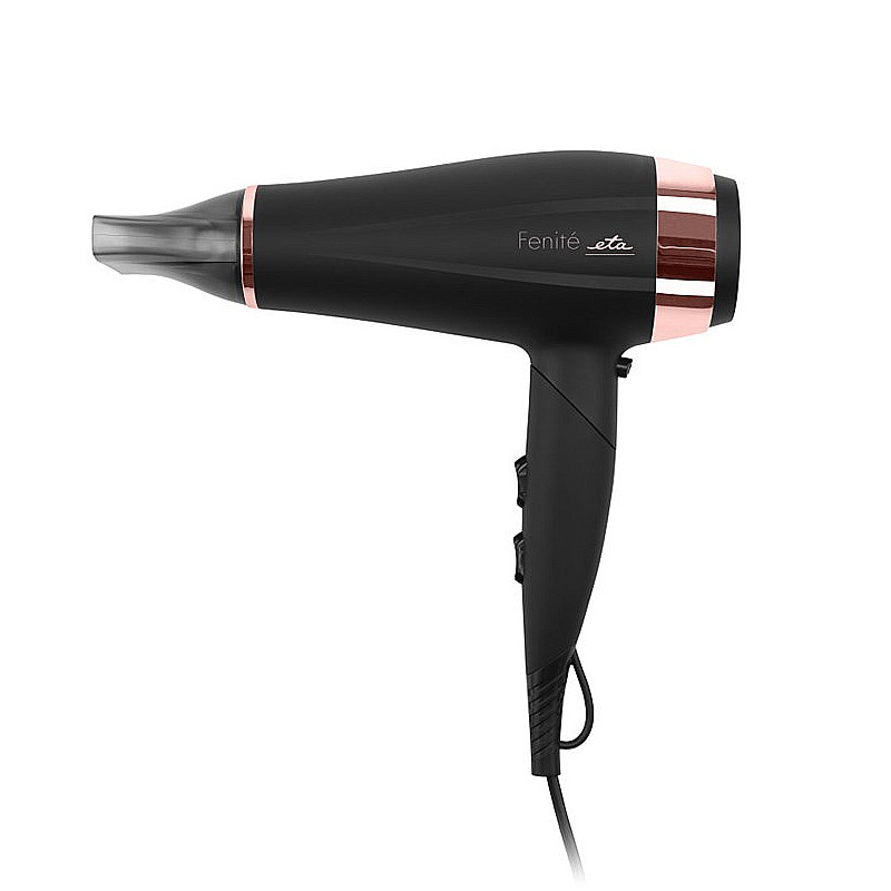 Sušič vlasov ETA Fenité je navrhnutý tak, aby sám odrážal všetko, čo svojim užívateľkám ponúka – pýši sa praktickým tvarom, jemnými líniami v čiernom prevedenie s rosegold detaily. Ergonomická rukoväť navyše perfektne padne do každej ruky. Napájací kábel o dĺžke 1,7 m pritom zaisťuje jednoduchú manipuláciu a nechýba ani praktické pútko na zavesenie.