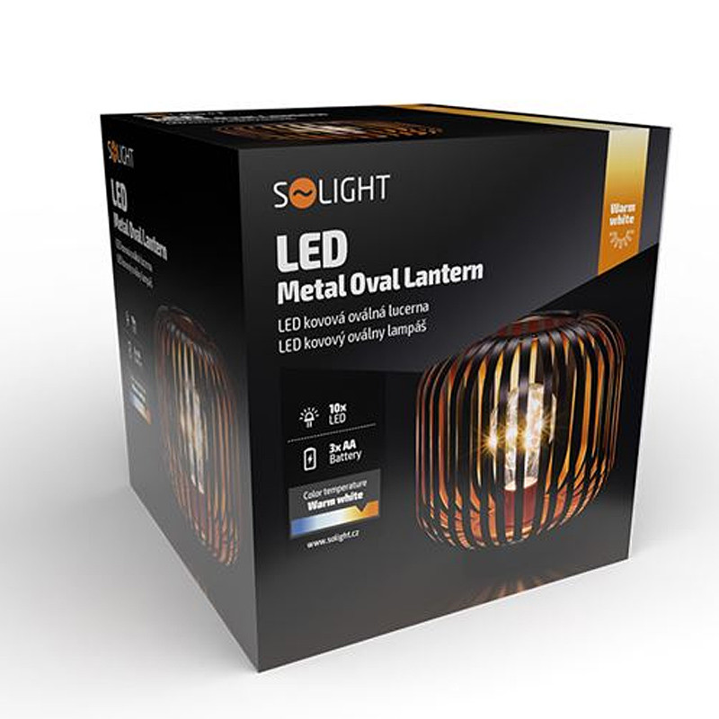 Dekoratívny kovový oválny lampáš so žiarovkou s 10 micro LED • farba svetla: teplá biela • napájanie: 3xAA • medený odtieň • výška: 18cm