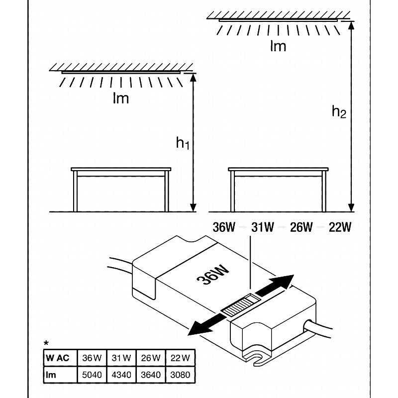Menovitý výkon: 36 W / 31 W / 26 W / 22 W