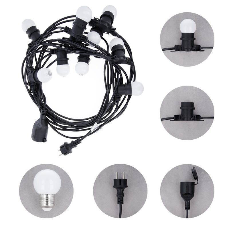 Vzdialenosť medzi žiarovkami je 1 meter a dĺžka celej girlandy je 12 metrov. Prvé 2 metre od zástrčky k prvej žiarovke vám umožňujú voľne nainštalovať girlandu bez obáv, že prvá žiarovka je príliš nízka! Posledný meter kábla umožňuje pohodlné predĺženie o ďalšiu girlandu. Prierez drôtu 2x0,75mm2 umožňuje pripojiť až 10 girlandy a osvetliť tak väčšiu plochu, ako sú tanečné parkety, reštaurácie alebo veľké záhrady.