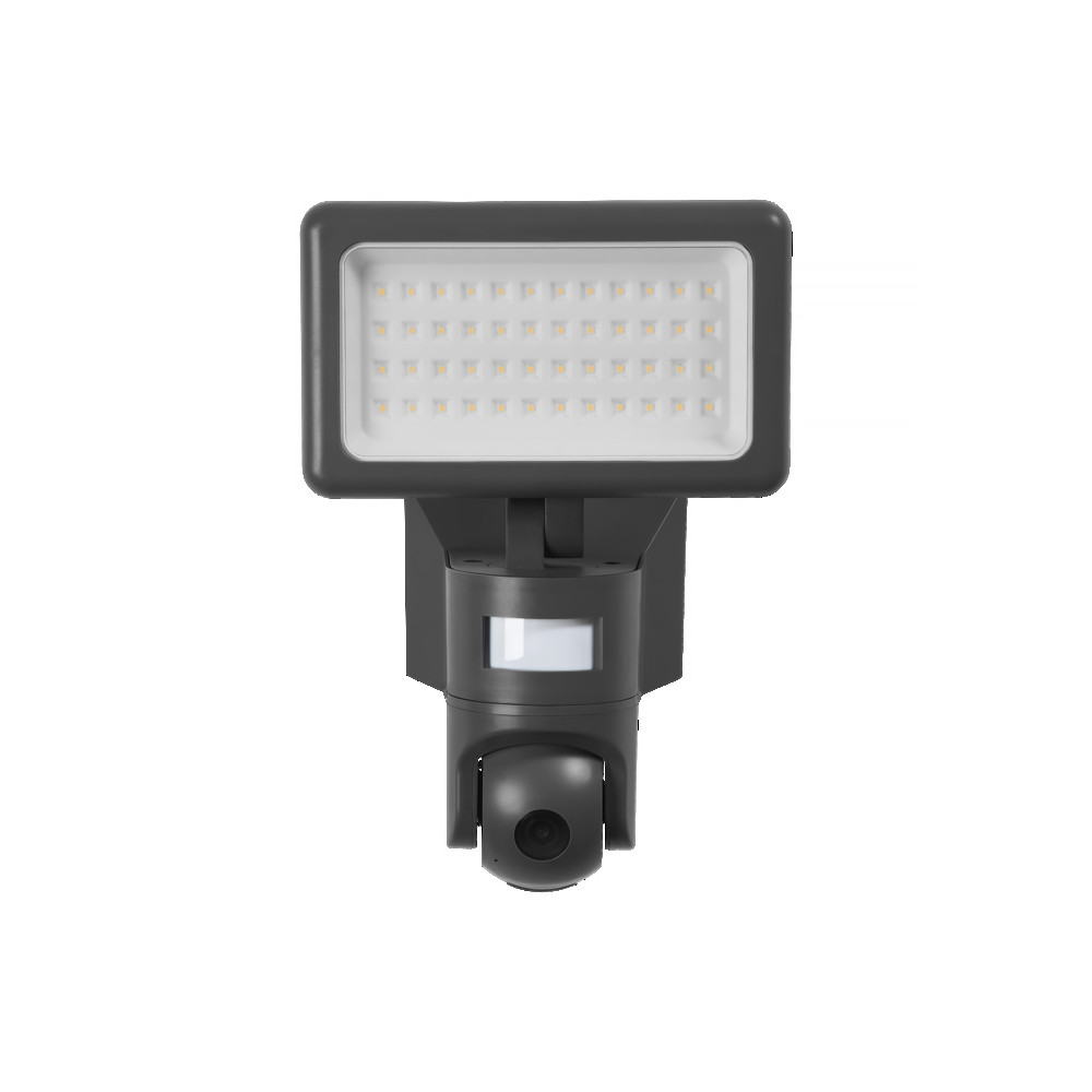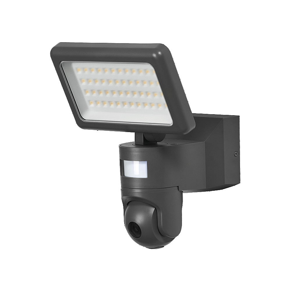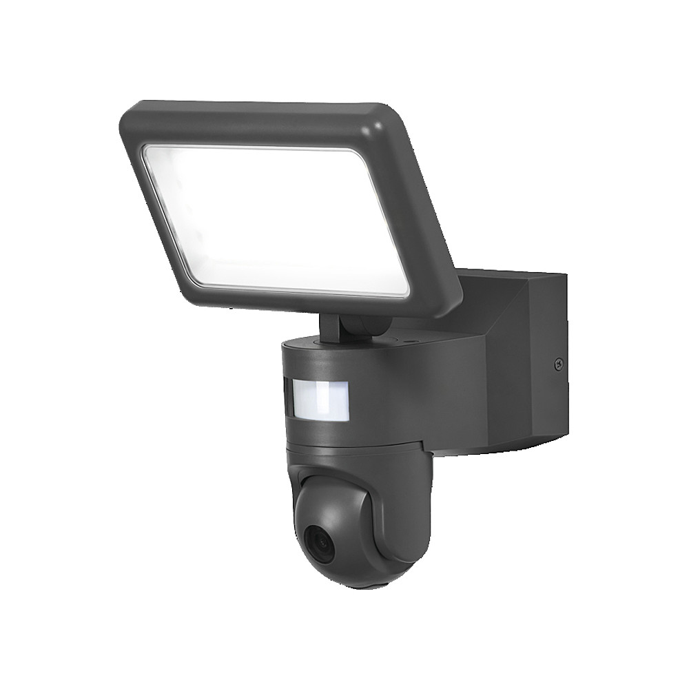 Smart WiFi nastaviteľný vonkajší reflektor a HD kamera ‒ výkon: 23 W • farba svetla: teplá biela (3000K) • svetelný tok: 2000 lm • farba: tmavosivá • PIR senzor • zabudovaný reproduktor a poplašná siréna