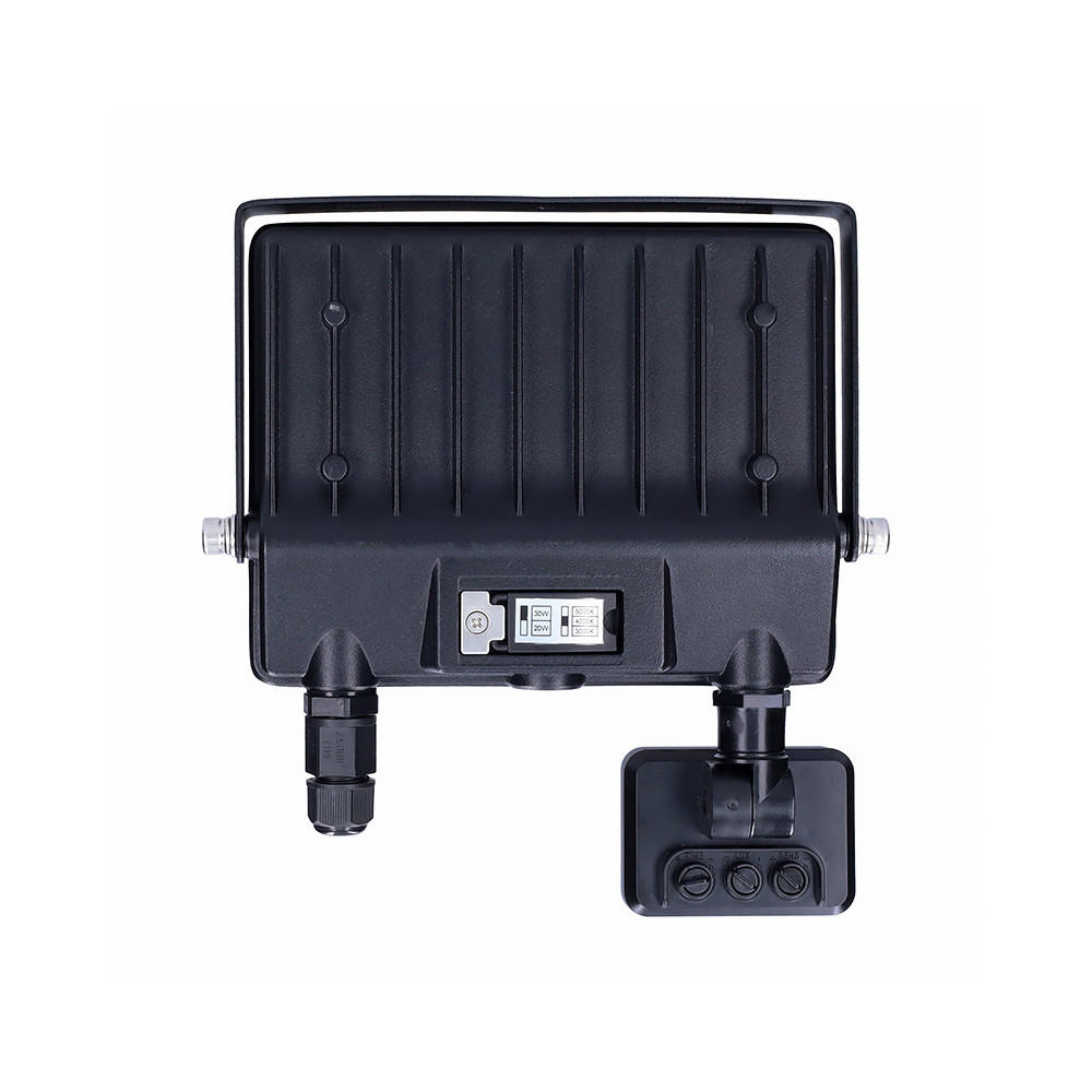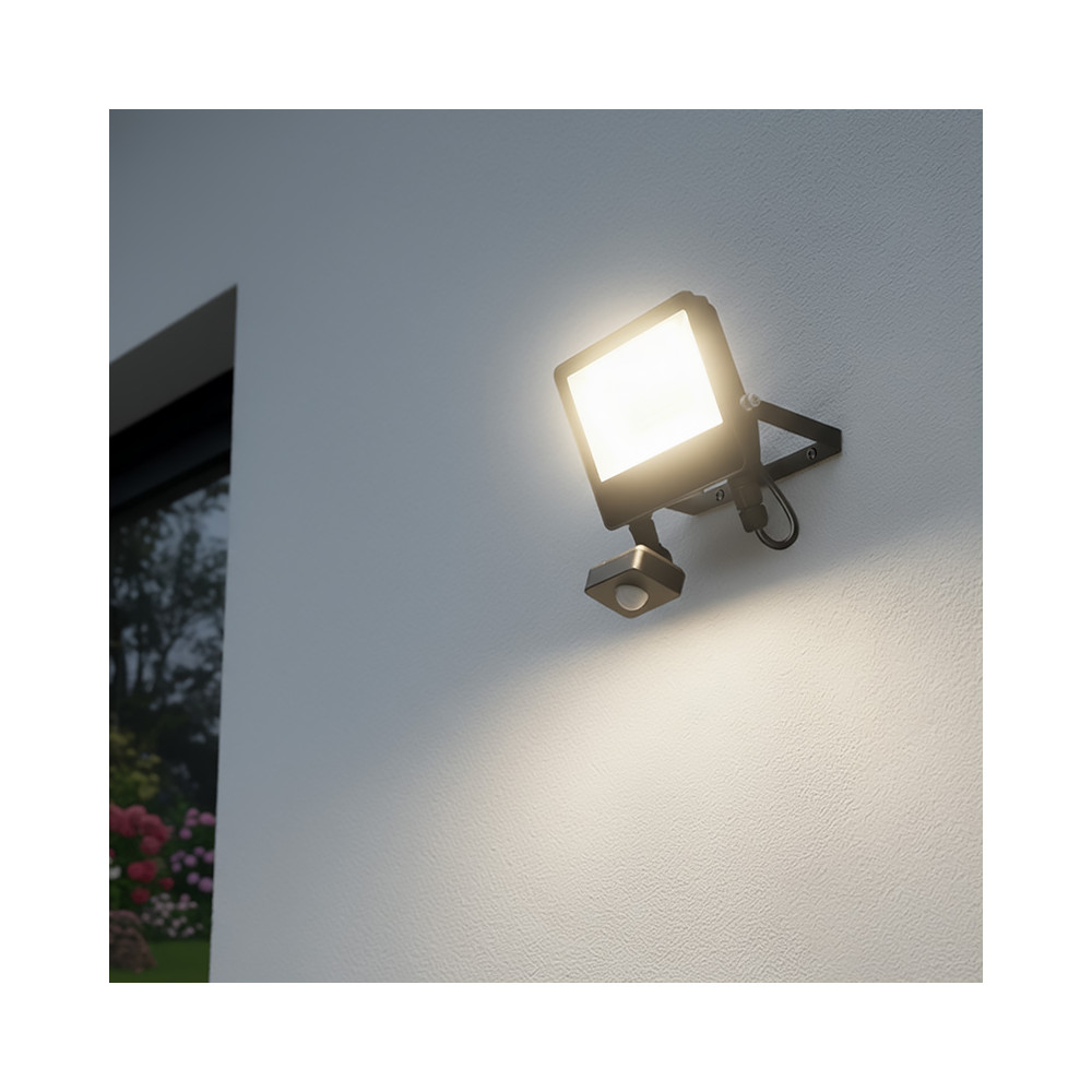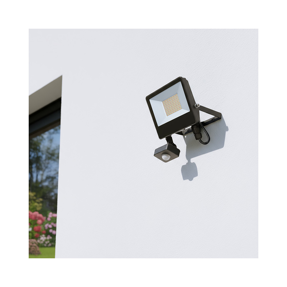 Reflektor umožňuje jednoduché nastavenie teploty svetla pomocou vstavaného prepínača v rozsahu 3000 K, 4000 K alebo 5000 K, takže si môžete zvoliť teplú, neutrálnu alebo studenú bielu podľa konkrétneho použitia. Široký svetelný kužeľ 120° a užitočný svetelný tok 3900 lm zabezpečia rovnomerné osvetlenie priestoru, zatiaľ čo vysoký index podania farieb CRI > 80 prispieva k vernej reprodukcii farieb. Reflektor je vyrobený z odolného hliníka v elegantnej čiernej farbe, má kompaktné rozmery 158 x 190 x 30 mm a životnosť LED dosahuje až 25 000 hodín. Možnosť nastavenia svetelnej citlivosti senzora v rozmedzí 3–2000 LUX podčiarkujú jeho úspornosť a univerzálnosť.