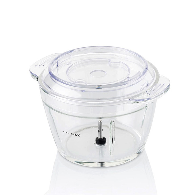Praktický sekáčik so sklenenou nádobou a ostrým titánovým nožom pre dokonalé rozsekanie a rozmixovanie potravín