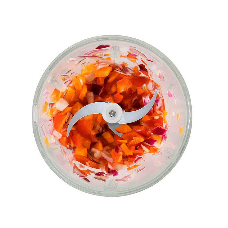 Sekáč so sklenenou nádobou - výkon: 400 W • 2 nože z nehrdzavejúcej ocele • efektívne drvenie: vhodné na mäso, zeleninu, ovocie, orechy, oriešky • odolná sklenená nádoba s objemom 1,8 litra • jednoduché ovládanie pomocou dvoch tlačidiel • 2 rýchlosti • funkcia STOP • jednoduché čistenie • ochrana proti prehriatiu • hladina hluku: 60 dB • hmotnosť: 2 kg