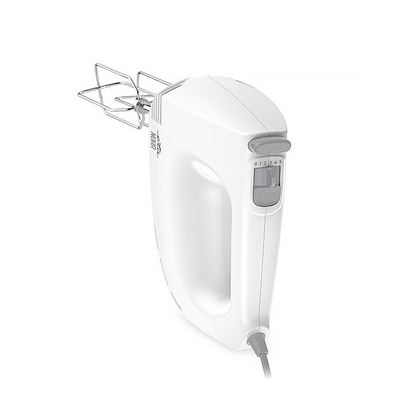 Ručný šľahač s AC motorom, príkonom 300 W, 5 rýchlosťami a funkciou TURBO, 2 šľahacie háky a 2 metly súčasťou balenia.