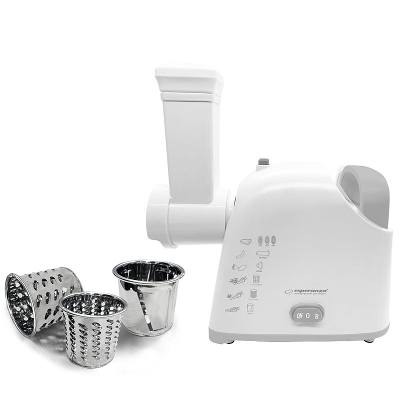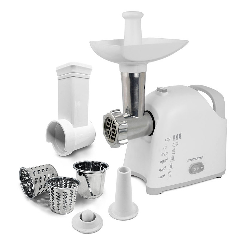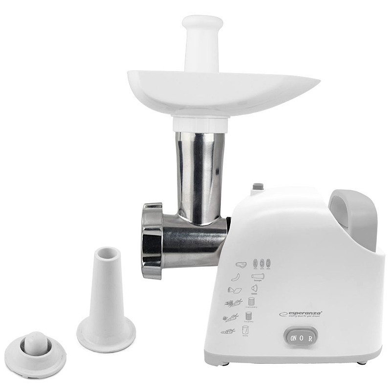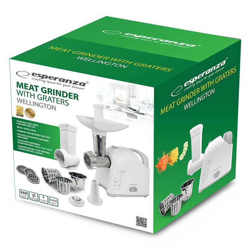 Mlynček na mäso so strúhadlom Esperanza WELLINGTON je moderný a funkčný prístroj, ktorý bude veľmi užitočný v každej domácej kuchyni. Zariadenie vo funkcii „mlynček“ veľmi ľahko pomelie nielen mäso, ale aj iné potravinárske výrobky a ďalšie nástavce vám umožnia vyrobiť klobásu alebo „kebbe“. Esperanza WELLINGTON sa počas funkcie „drvenie“ skvele hodí na strúhanie ovocia, zeleniny, tvrdého syra, čokolády, orechov alebo prípravu crumble. Protišmykové gumené nožičky zaručujú stabilnú a bezpečnú prevádzku zariadenia.