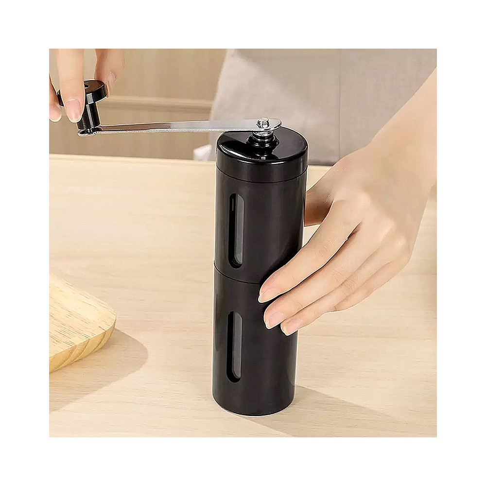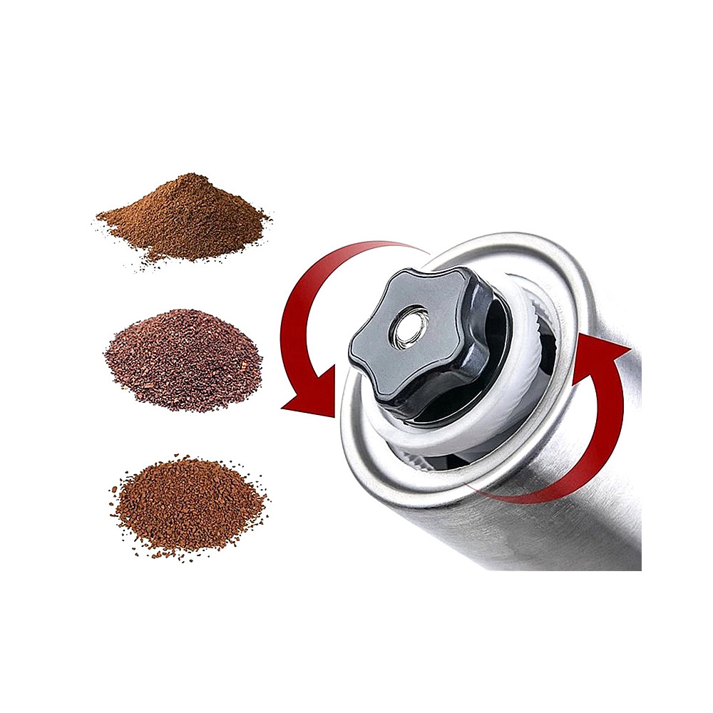 Ručný mlynček na kávu vybavený nastaviteľnými mlecími mlecími kameňmi. Nastaviteľné nastavenie mletia umožňuje zomlieť zrná na požadovanú veľkosť. Štíhly a robustný kryt zaisťuje dlhotrvajúce a bezproblémové používanie. Ďalšie kontrolné okienko v spodnej časti mlynčeka umožňuje sledovať množstvo mletej kávy.