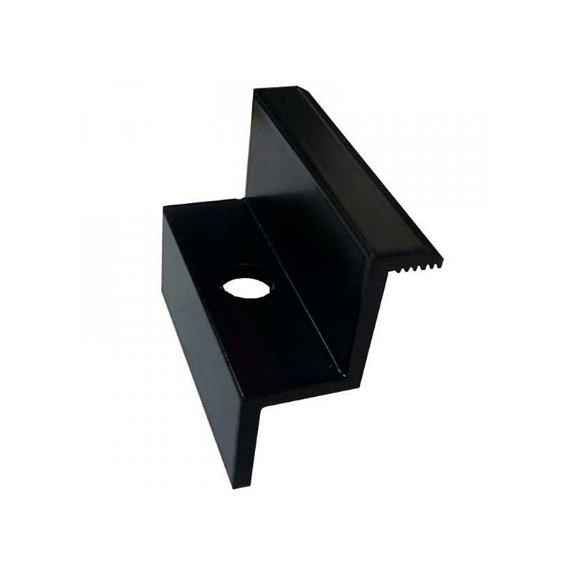 Koncový hliníkový úchyt určený pre koncové upevnenie fotovoltaických panelov s hrúbkou 30 mm. Tento úchyt sa montuje na koniec panelu a zúbkovanie na styčnej ploche zabezpečuje pevné a stabilné uchytenie. Montážny otvor M8. Farba: čierna.