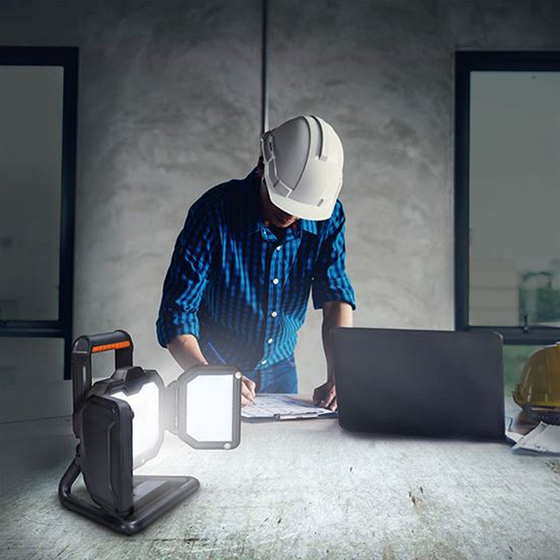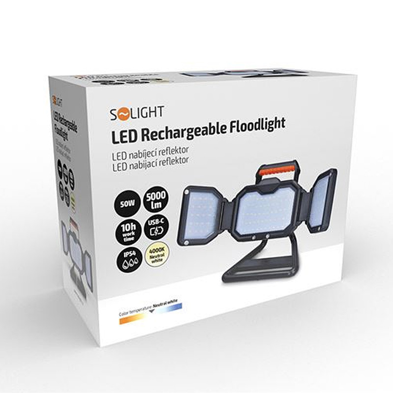 Prenosný, nabíjací a polohovateľný LED reflektor - svetelný tok: 5000 lm • výkon: 50W • neutrálna biela • režimy svietenia: 100%, 50%, 20% • krytie: IP54 (vonkajšie použitie) • napájanie: USB-C 5V (napájací kábel súčasťou)