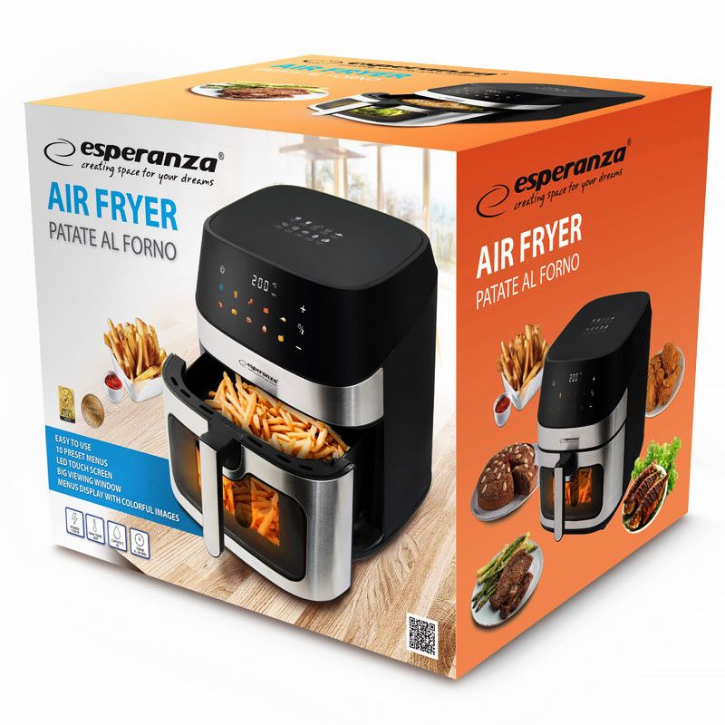 Horkovzdušná fritéza Esperanza PATATE AL FORNO je perfektným riešením pre tých, ktorí si chcú vychutnať chuť svojich obľúbených jedál v zdravšej verzii. Vďaka technológii cirkulácie horúceho vzduchu si môžete pripraviť chrumkavé hranolky, šťavnaté mäso, chutnú zeleninu a dokonca aj pečené ovocie – to všetko bez použitia oleja a bez kompromisov v chuti. Vďaka veľkému 8-litrovému objemu je ideálna na varenie jedál pre celú rodinu. Intuitívny ovládací panel s farebnými ikonami a až 10 prednastavenými programami (vrátane režimu pre ovocie a funkcie rozmrazovania) zaisťuje jednoduché ovládanie a presné nastavenie nastavení varenia.