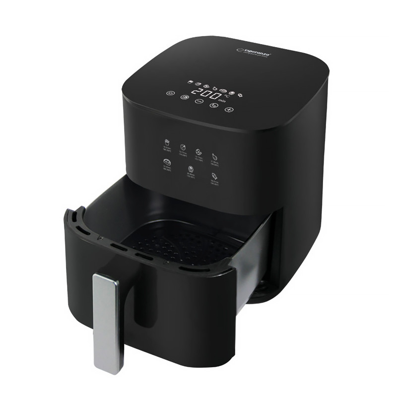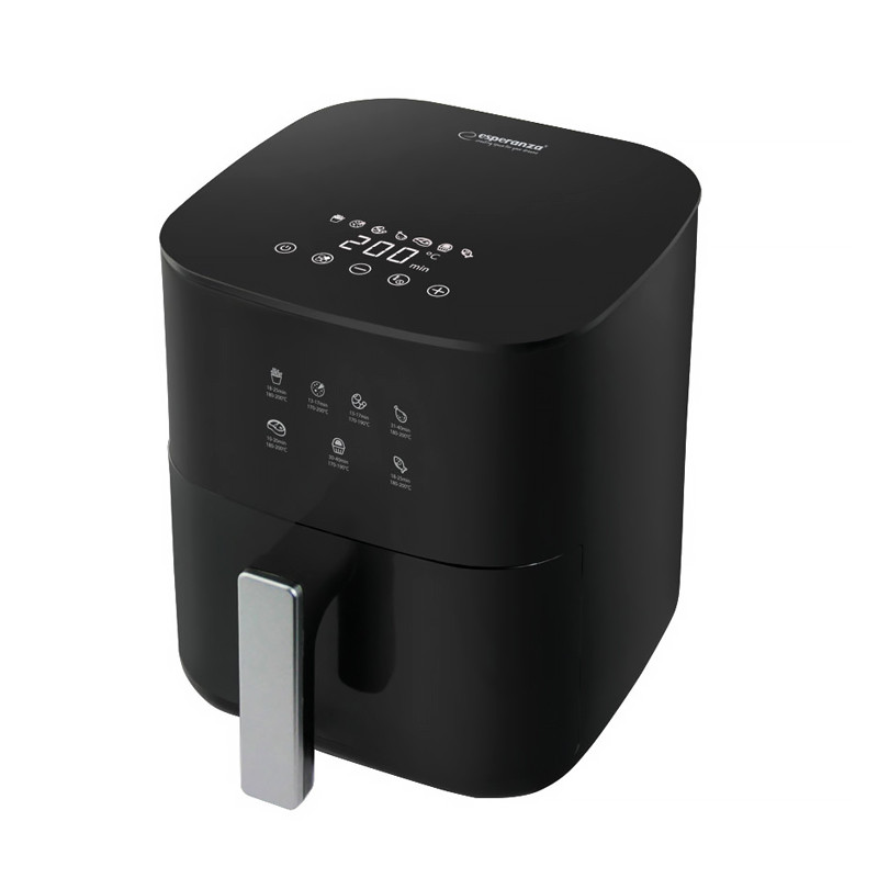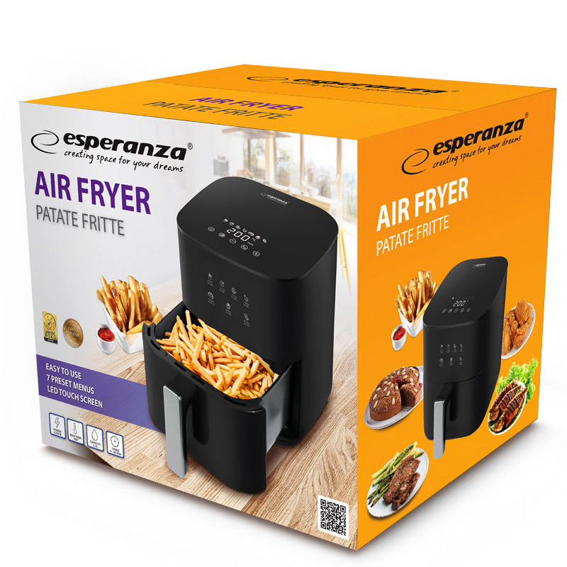 Fritéza bez oleja Esperanza PATATE FRITTE je perfektným riešením pre tých, ktorí si chcú vychutnať chuť vyprážaného jedla zdravším spôsobom. Tento spotrebič vám umožňuje pripraviť chrumkavé hranolky, šťavnaté kuracie mäso alebo chutnú zeleninu bez použitia oleja – rýchlo, pohodlne a bez kompromisov v chuti. Vďaka vysokému výkonu a cirkulácii horúceho vzduchu je jedlo rovnomerne prepečené a hotové už za pár minút. Jeho moderný dizajn z neho robí štýlový doplnok do každej kuchyne, zatiaľ čo intuitívny ovládací panel so 7 prednastavenými programami varenia zaisťuje jednoduché používanie.